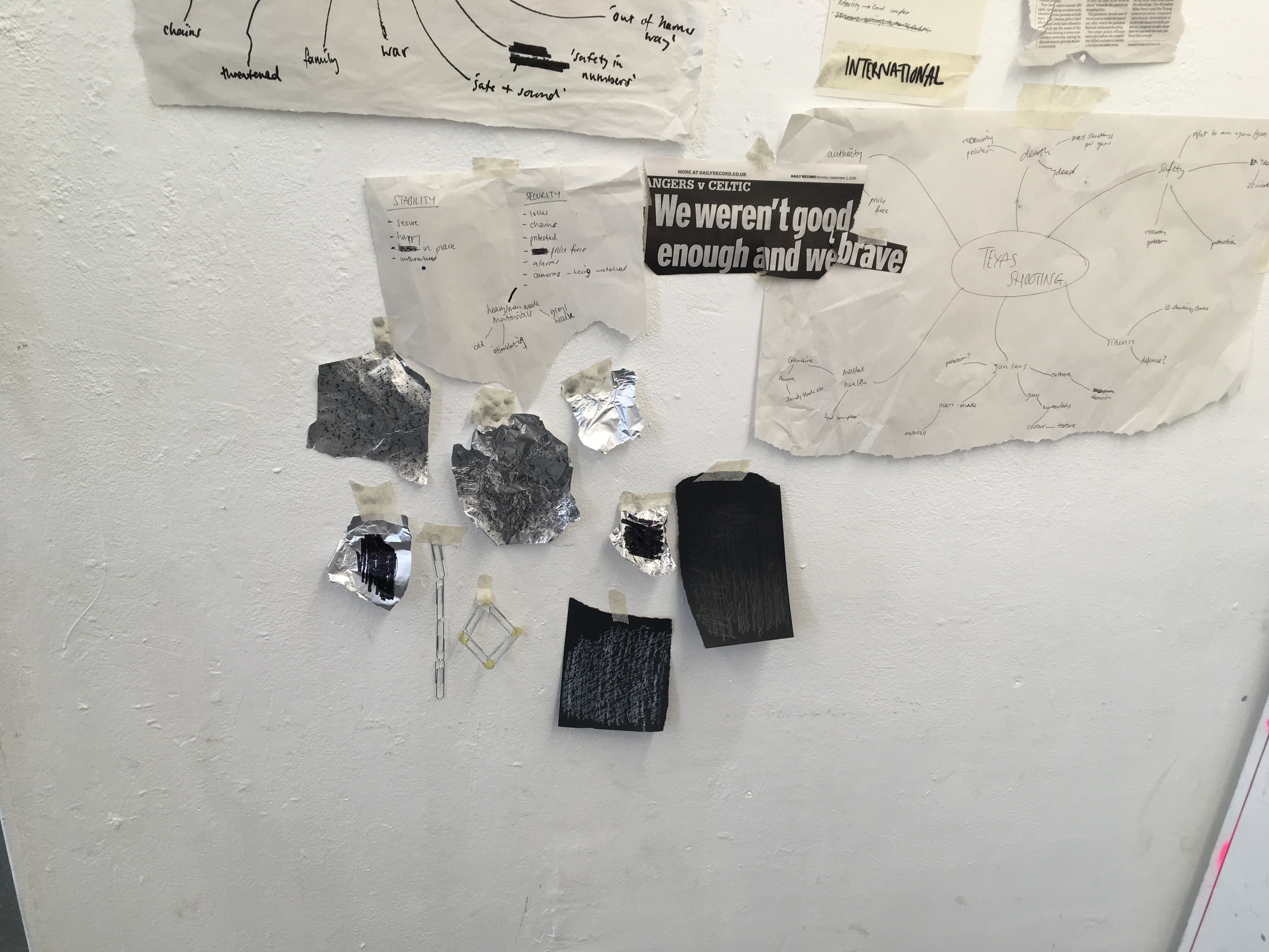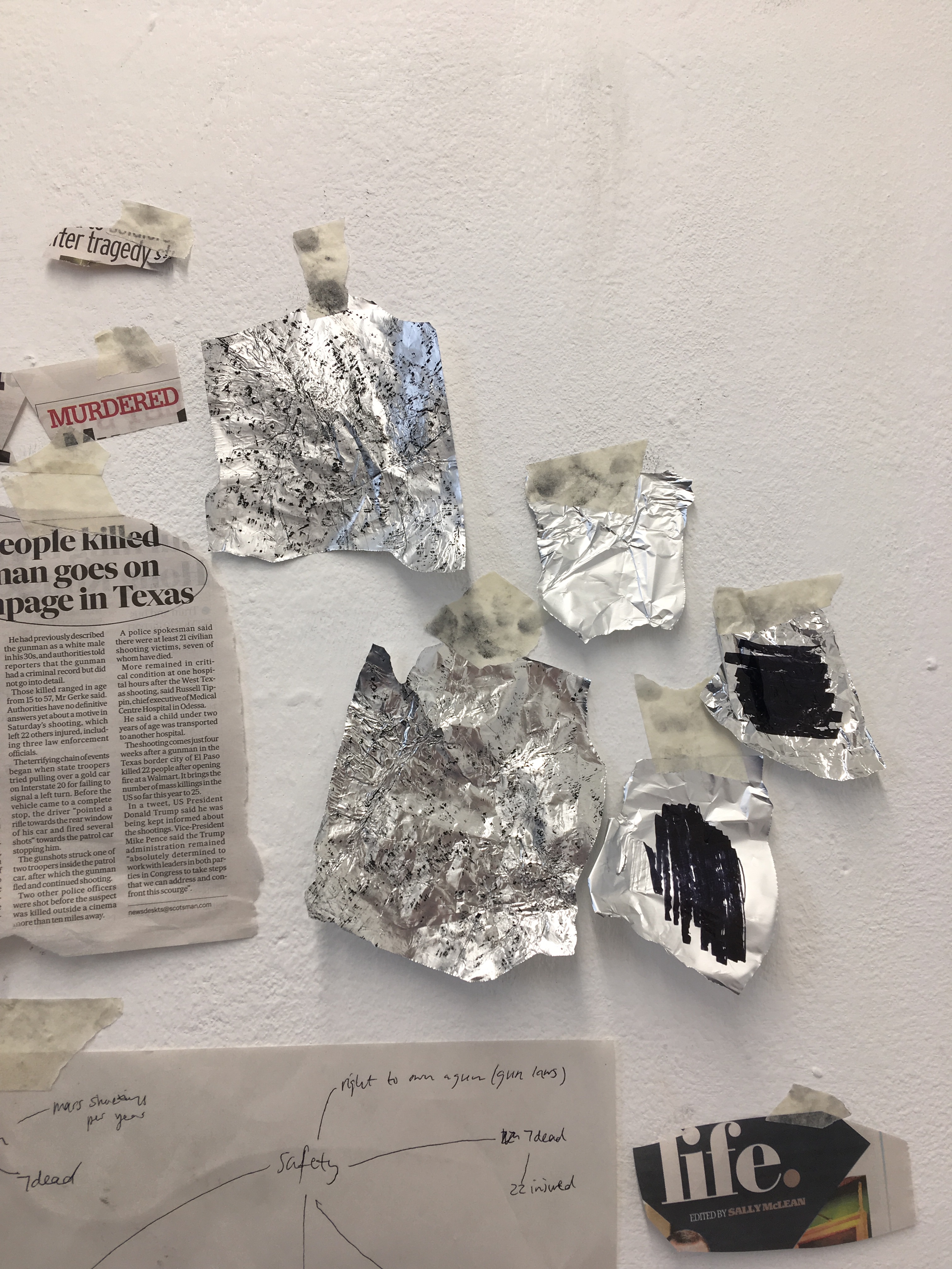 I then made a few sample pieces of textures which related to guns, using charcoal and marker pen on tinfoil. I also used white crayon and pencil on black paper to try out some colour ideas.