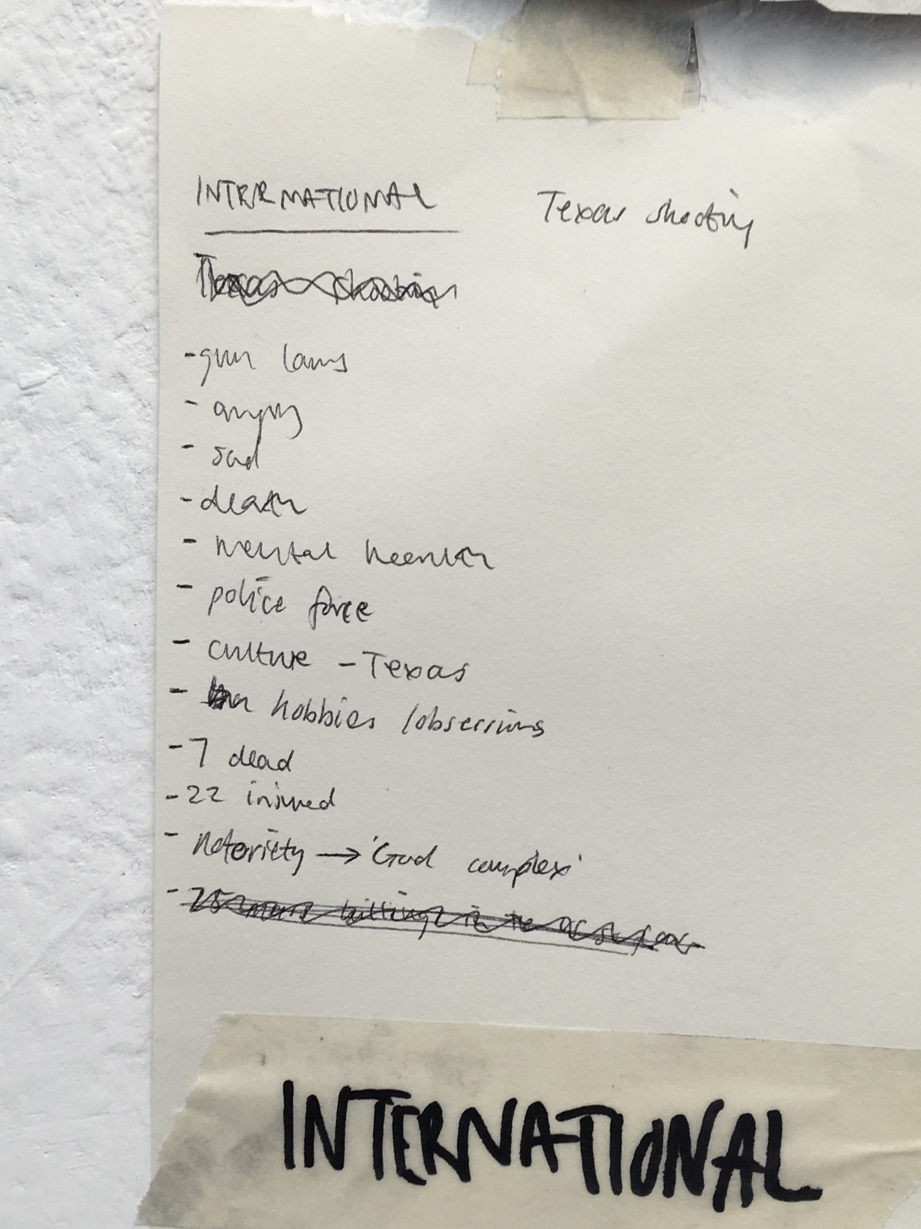For my first day of this project, I started by looking through newspapers. After circling a few stories, I settled on a international article about a mass shooting which took place in Texas just two days ago (August 31), which tragically left 7 dead and 22 injured.