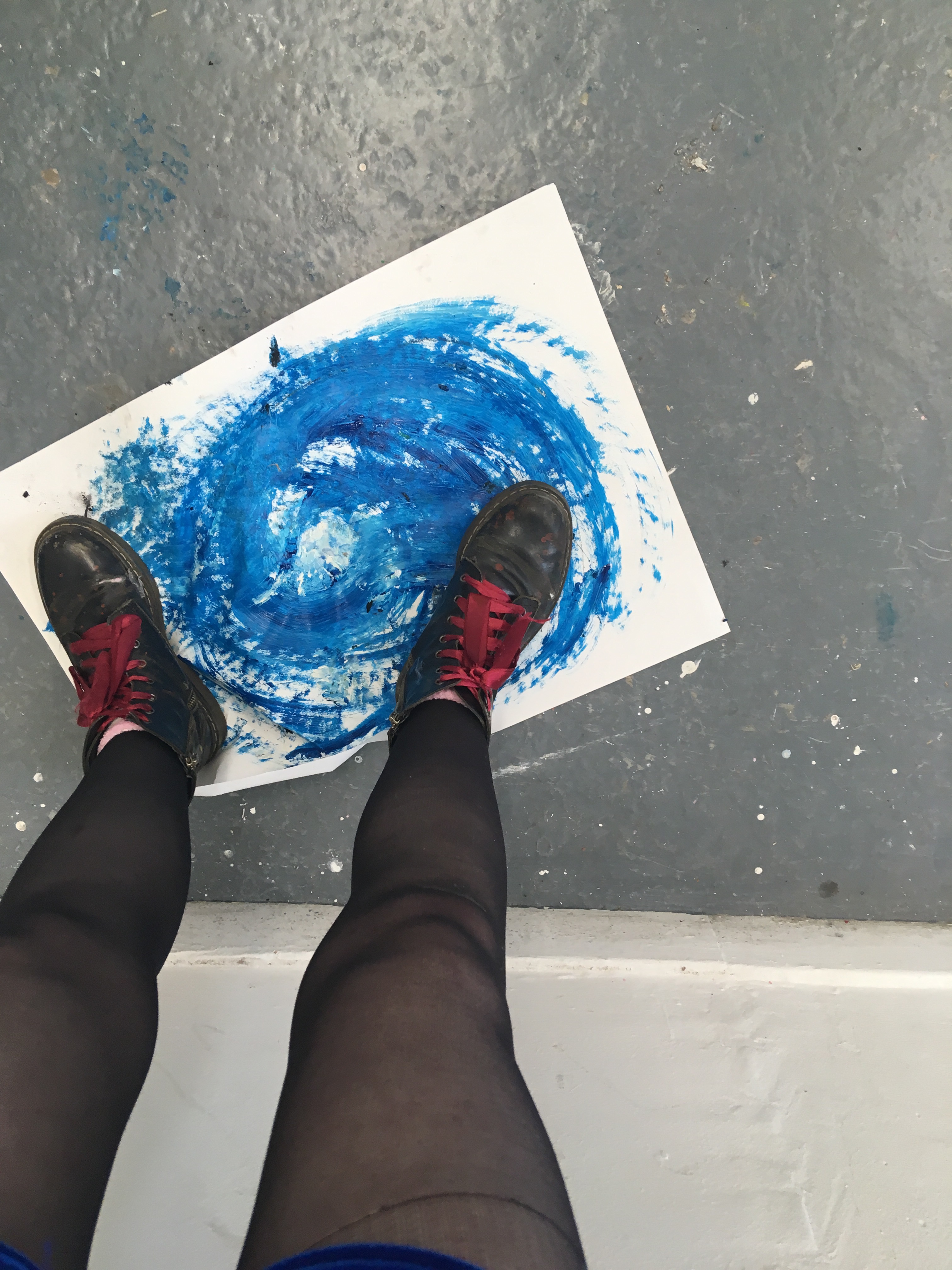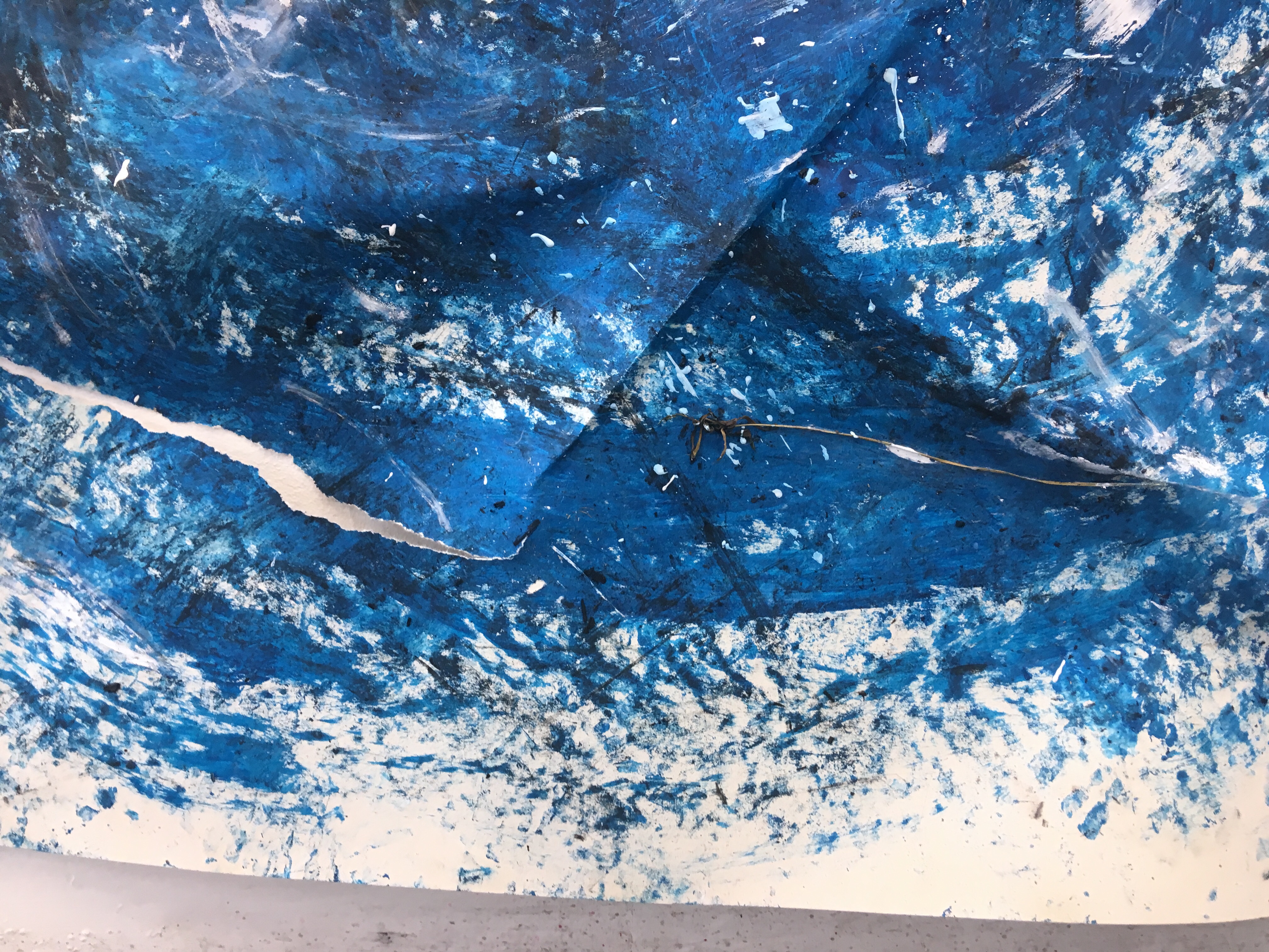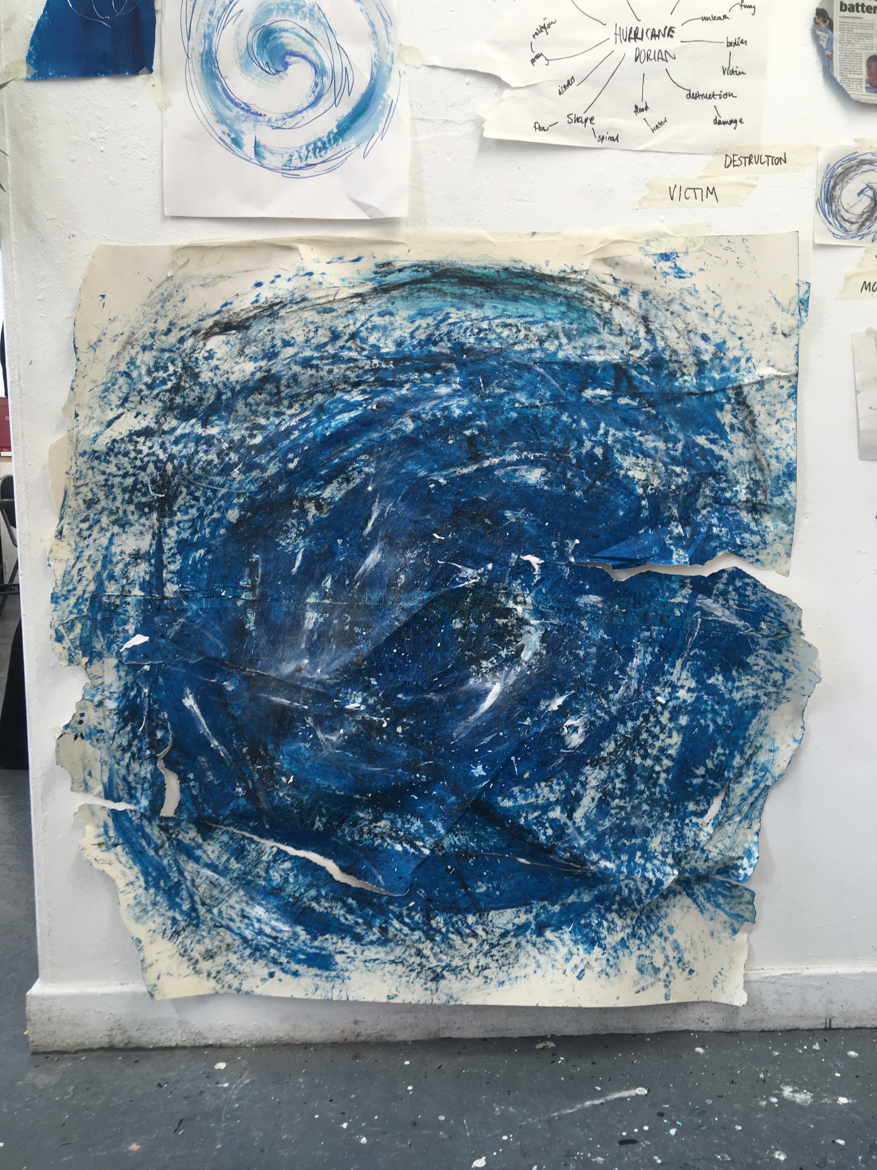 Inspired by the key word ‘destruction’ I thought of how this could be transferred in my work. The following pictures show my piece before, during, and after destruction. I did this by stomping on the piece, kicking it, and rubbing my hands on it. I added broken chalk and charcoal to this too to add colour and texture. I loved this effect and thought it had a huge impact on my work. It’s definitely a process I’d like to use in future work.