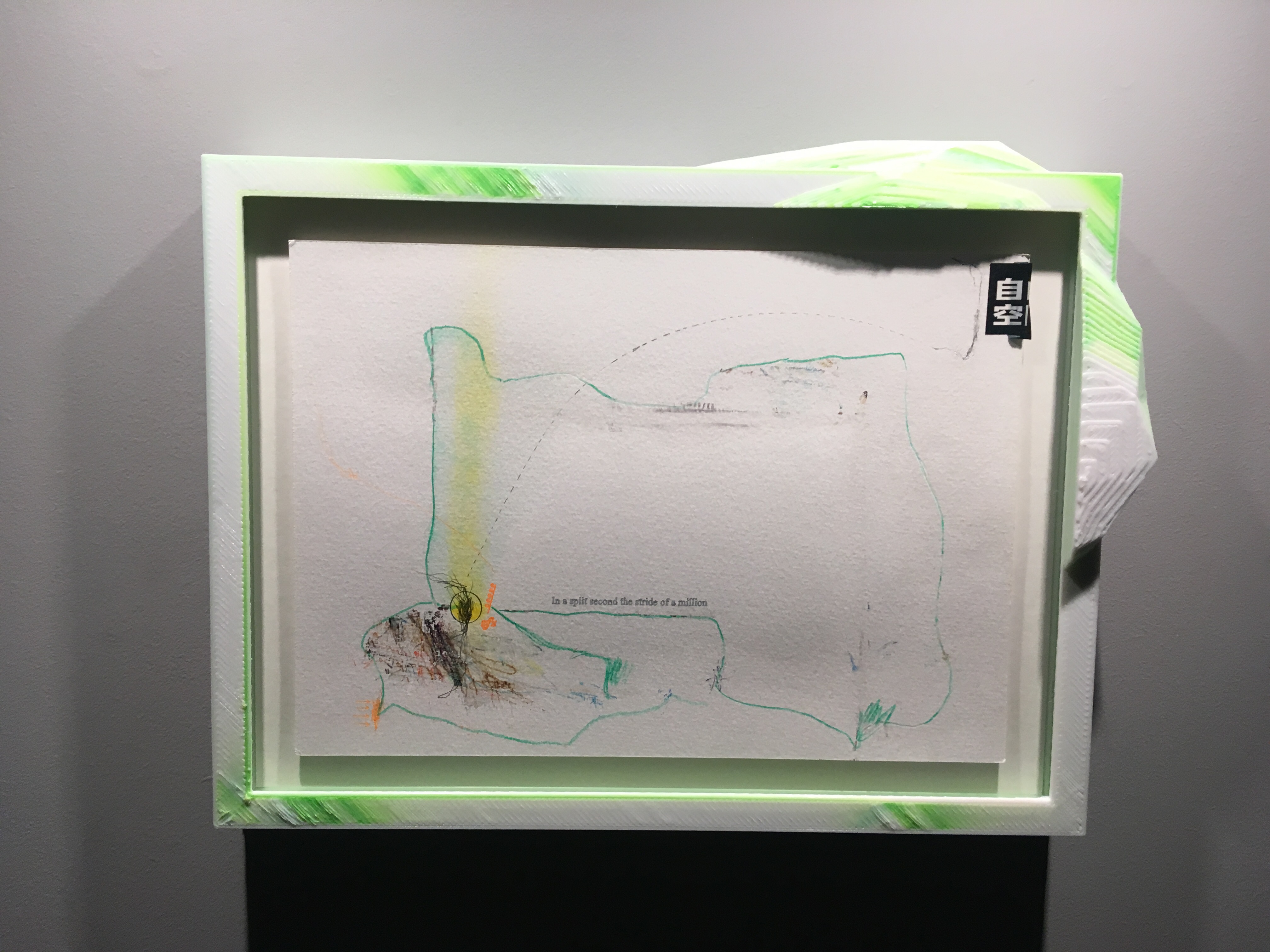 The following images are from the balconies above. I loved these small multimedia pieces by Samson Young. Each white canvas contained a different drawing or print relating to music. Most also contained a short sentence – my favourite being below reading ‘Flags like moths wings’. Each frame also had texture to it, some being 3D printed. I feel this made the piece more unique and related to the artist as he is known for using 3D printing in his work often.