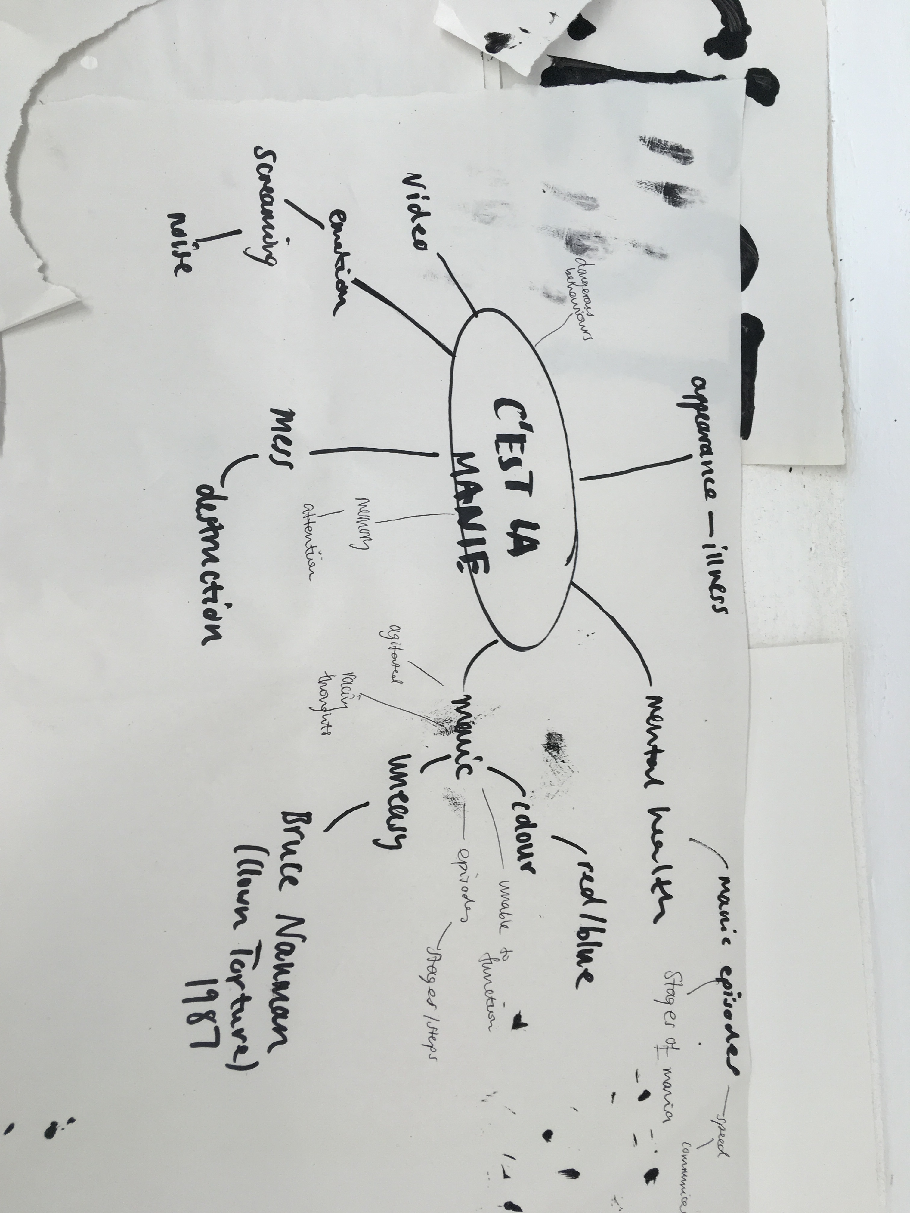 At this point, I was worried I had exhausted the direction I was going in. I felt I hadn’t done enough development and that this weeks work was too similar to last week. My work had progressed slightly by using new techniques with this subject matter, but I wasn’t sure where to go next and found myself feeling stuck. After receiving some feedback, I decided to explore the theme of mania more. I also wanted to change media and explore more with video as I enjoyed trying it the week prior. I made a mindmap of words associated with the title ‘C’est la manie’ (It’s mania).