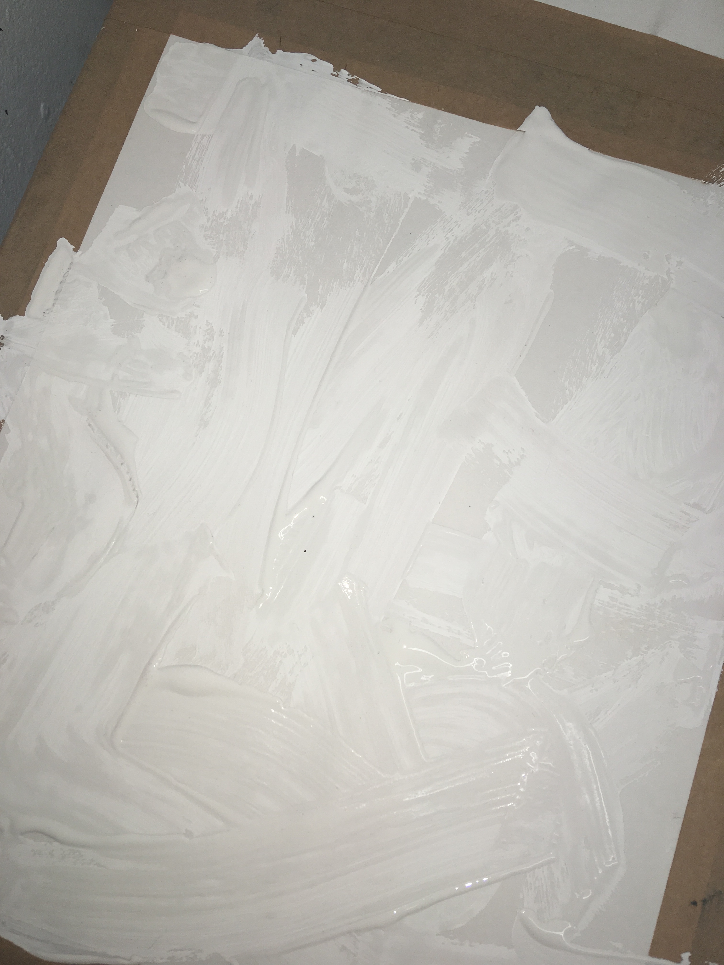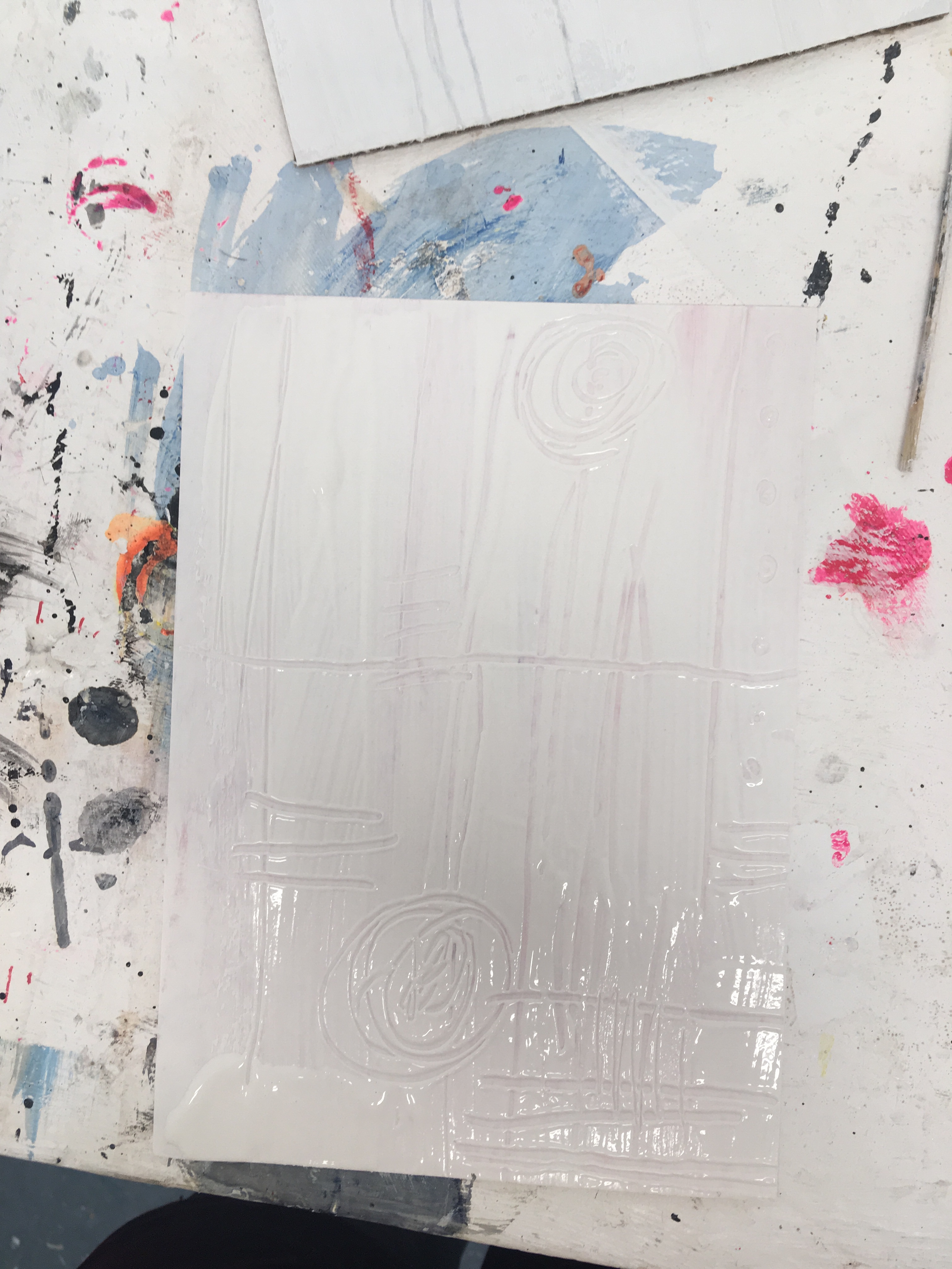 The next step was to base my paper with a layer of emultion. I wanted to use the emulsion to my benefit by experimenting with thickness and layering. Some of my bases had a thick layer of emulsion applied, which I worked into by scratching shapes. Others had a thinner base, giving the piece a dry appearance and allowed me to work a lot faster time wise.