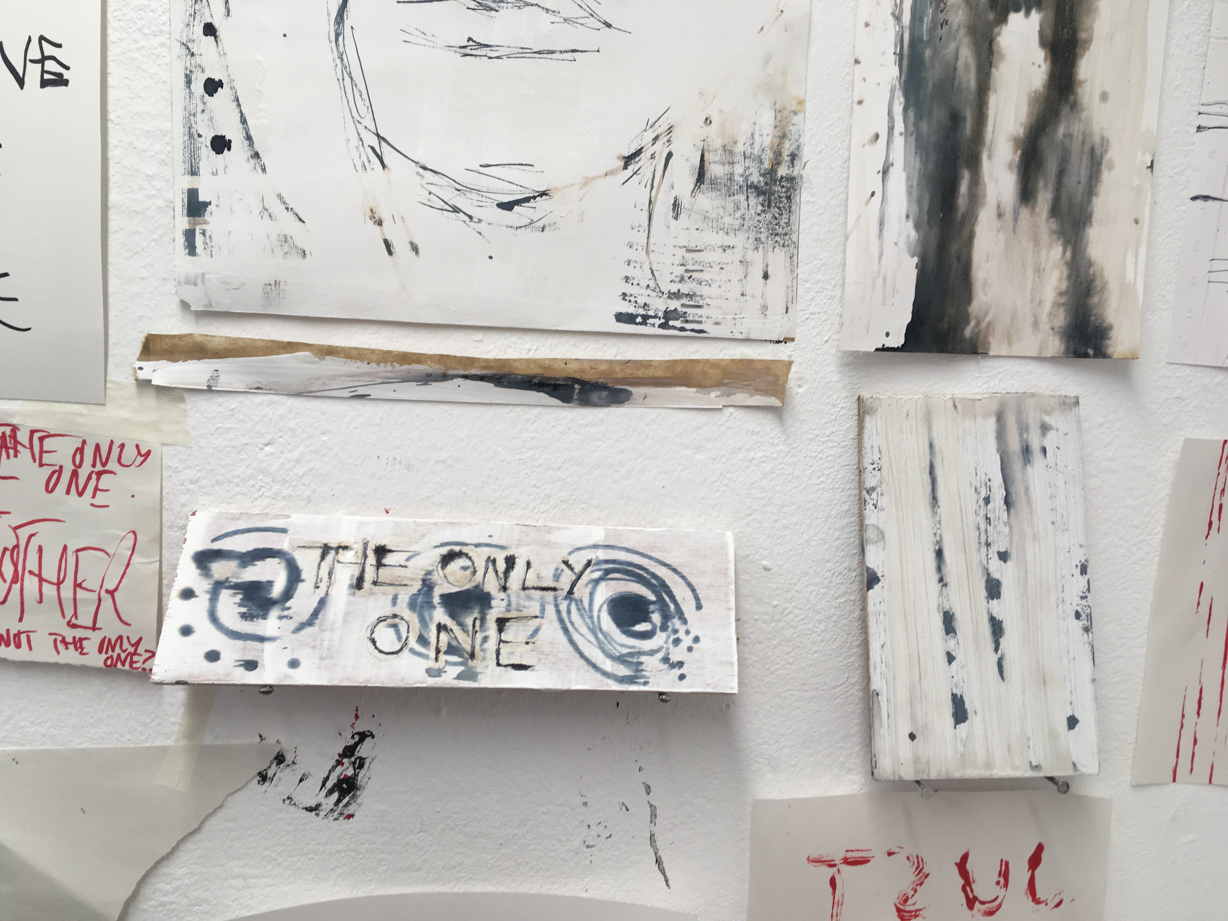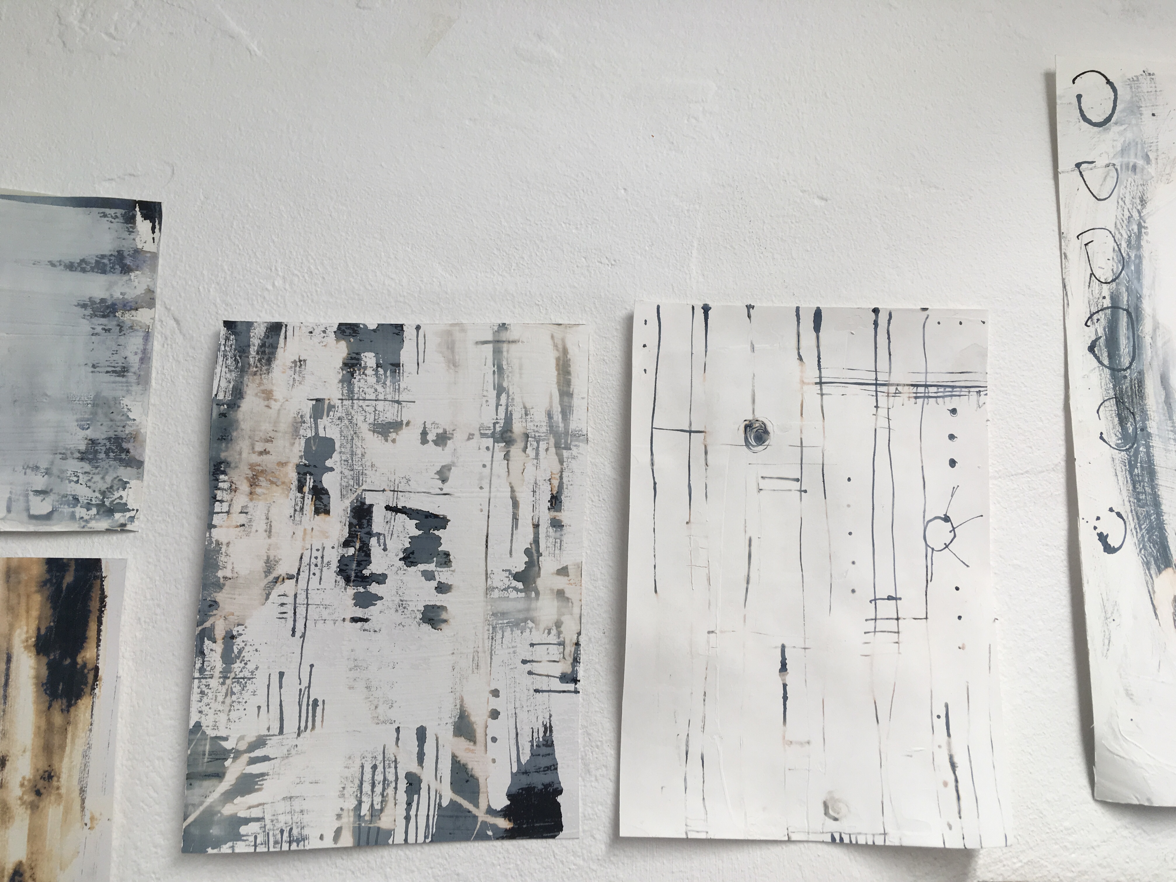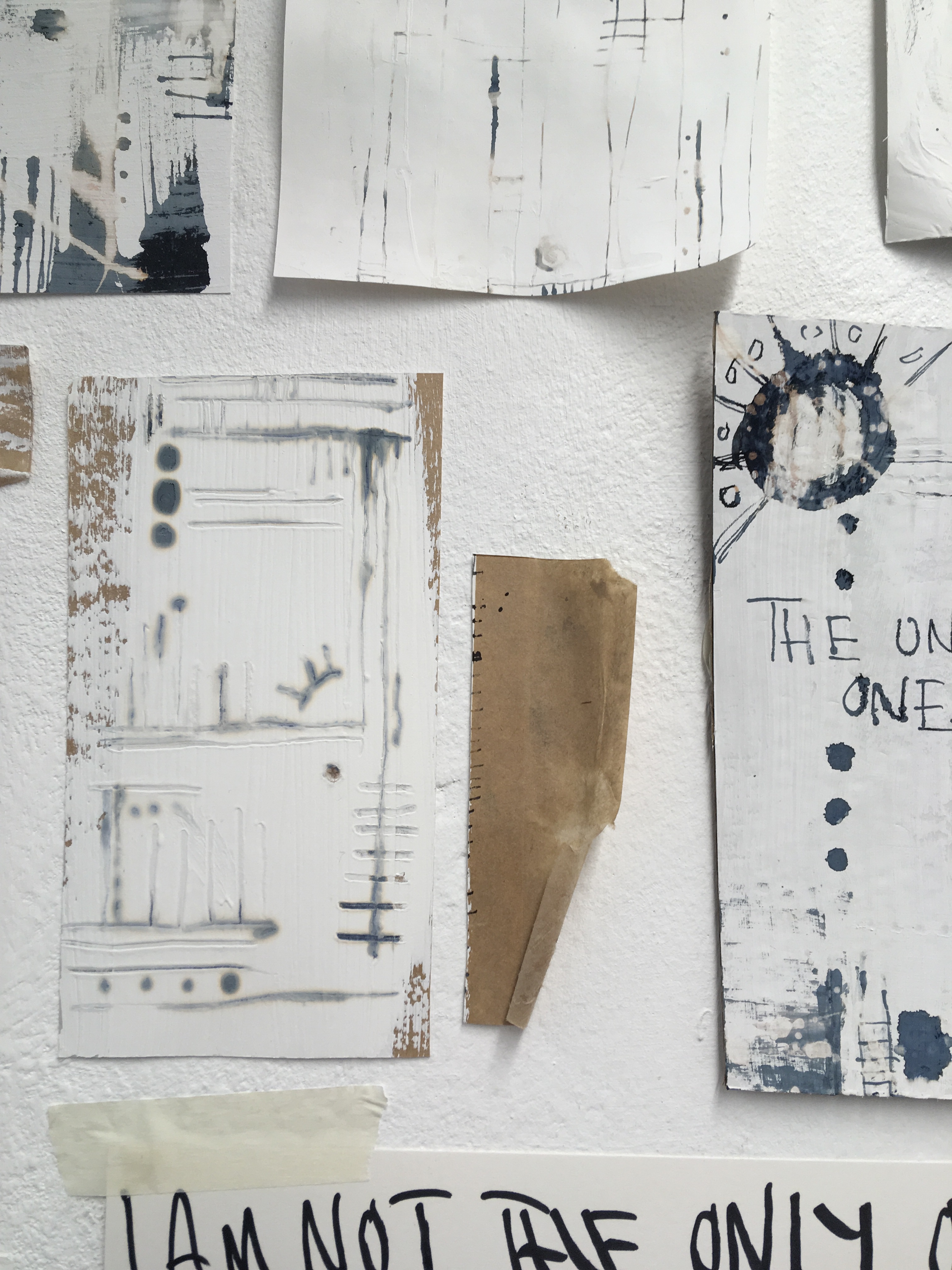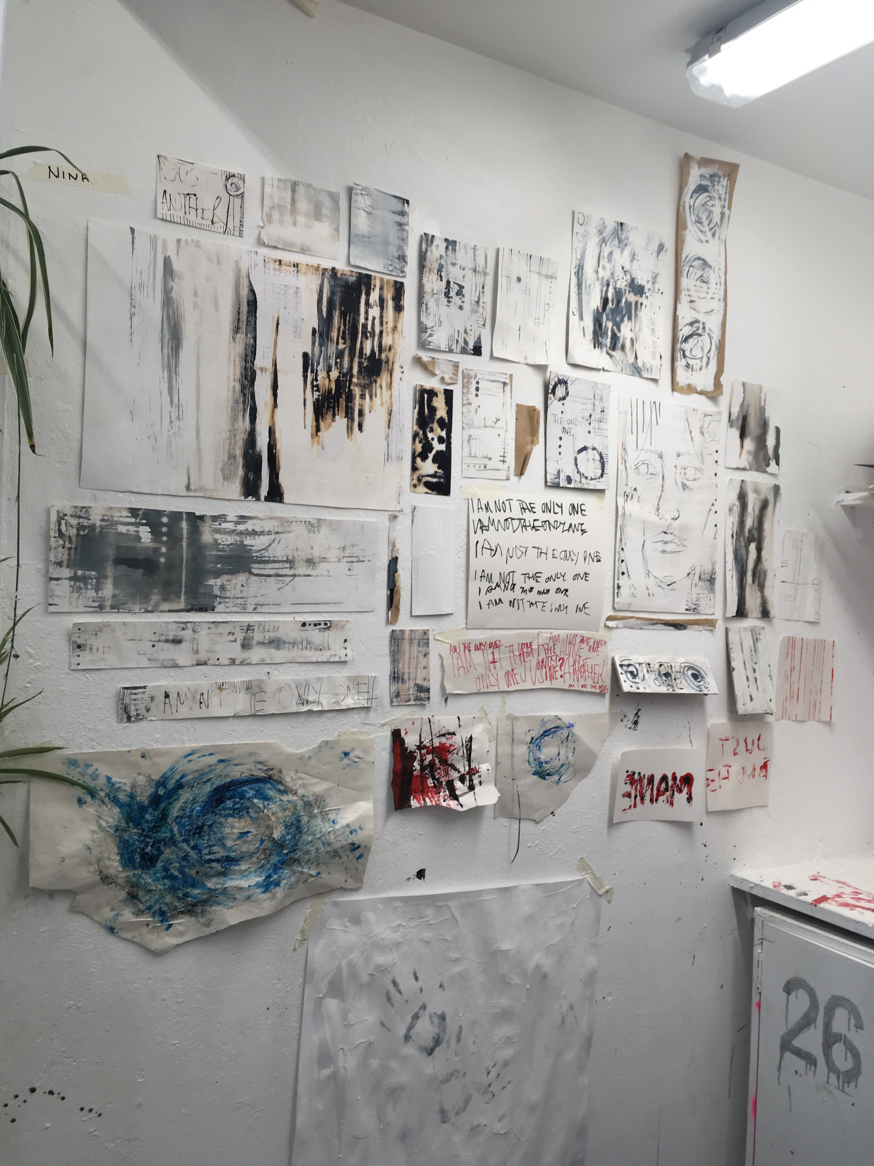 After putting down a basecoat of emulsion, I used ink and bleach to create pieces inspired by our work in the DayToday project. The subject matter I focused on were; spirals inspired by the hurricane story, lines inspired by my ‘Just Another’ pieces, and portrait work from my ‘Manie’ pieces.