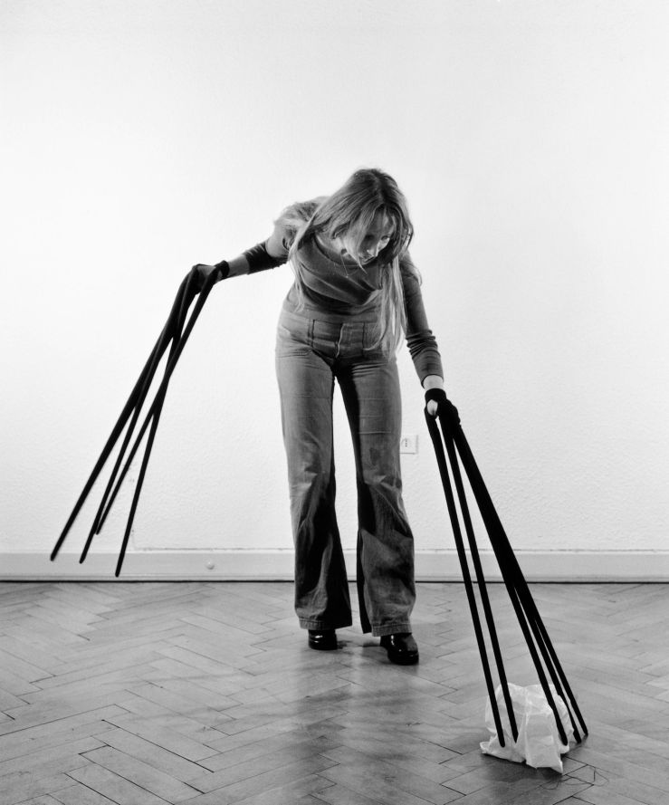 The art work ‘Finger Gloves’ is part of a series of extensions of the body (including ‘Trunk’, ‘Head Extension’, and ‘Arm Extensions’). It shows the artist walking down an empty room, wearing two black metre long prosthesis on each hand, each with five ‘fingers’ made from wood and fabric which are attached to the wrist by straps. Filmed through the doorway, she walks steadily through the middle of the white room wearing these gloves as they scrape the walls either side of her. The gloves audibly scrape on the walls, creating a sense of unease and an eerie atmosphere.