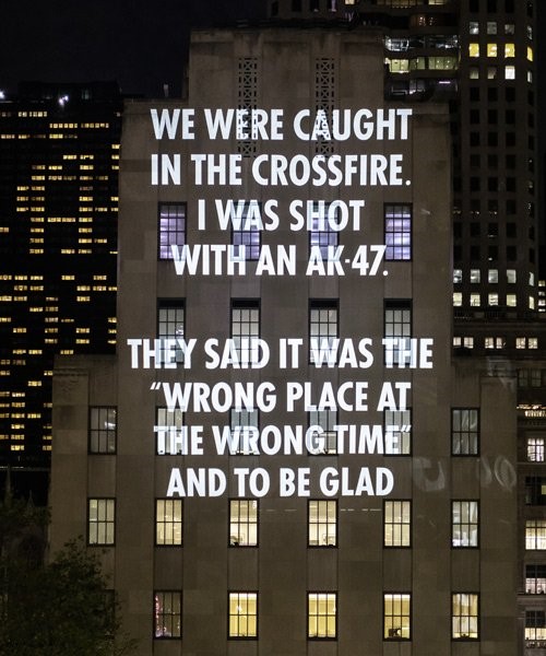 Jenny Holzer is mostly known for her public large-scale installations, created through billboards, posters, and projections. She includes every day outdoor structures, from buildings to benches, as well as posters hung on public walls. The outside world is her canvas. I feel the use of public spaces to display her work relates to fighting back as a feminist artist in the 1980’s. Throughout the last century, it is evident that women have struggled to be seen in the art world and are not equally represented in gallery spaces as men are. By displaying her work in public, Holzer is fighting against this issue by giving people no other choice but to see her work. Furthermore, Holzer’s subject matter often expresses feminist/political issues. This is demonstrated in the piece below which speaks of the gun laws in America.