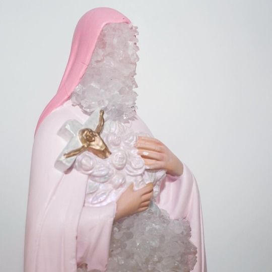 In Catholicism, the Virgin Mary is recognised as a guardian and strong figure to protect and heal. Montgomery’s intention through these sculptures is to combine his idolisation for Mary with the positive and healing ‘powers’ which these crystals may hold. To make these statues, which he began making around 2012, Montgomery searches online auction websites for pre-loved Mary statues which he then carves and reconstructs before adding the crystals. These particular statues can take anywhere from days to years to complete. When asked in an interview of his current religious viewpoint he simply replied “I believe in something”.