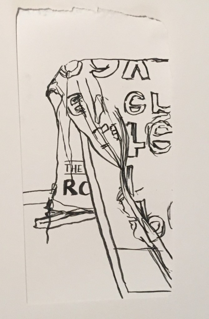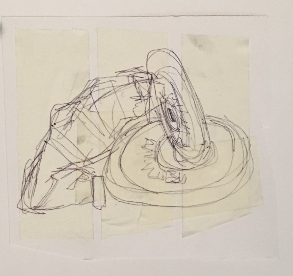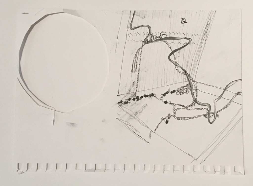 I wanted to focus on some new photographs from the mural so my work wasn’t too similar to the previous task. I was conscious of the different surfaces I was drawing on, using carboard, scrap paper, masking tape and sometimes a combination of two of these three together. As my work from the first task was very loose and quick, I wanted to spend more time on the details, for example on the chains of the necklace and the scores to show the rope/string. I most enjoyed using a combination of masking tape and fine liner as it created a 3D and realistic effect, bringing the plant to life. I particularly liked the third drawing in the below slideshow of the jewellery box. This was due to the surface, using scrap paper which had charcoal marks and cut out from the circle/spiral drawing. I like the juxtaposition of drawing something seen as precious on scrap paper that would normally be rejected as it was unclean.