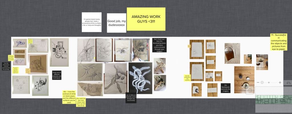 We then had small group tutorials over video call in which we presented our work and had a casual discussion about what was successful and unsuccessful. I enjoyed being able to talk to my classmates again and found it beneficial to see their work alongside mine, comparing the different approaches we all took. As we cannot be in the studio as before, I think this method is the closest thing to it in current circumstances. We all left feedback notes in our MURAL room which left me feeling a lot more confident and happy with my work than when I went into the call.