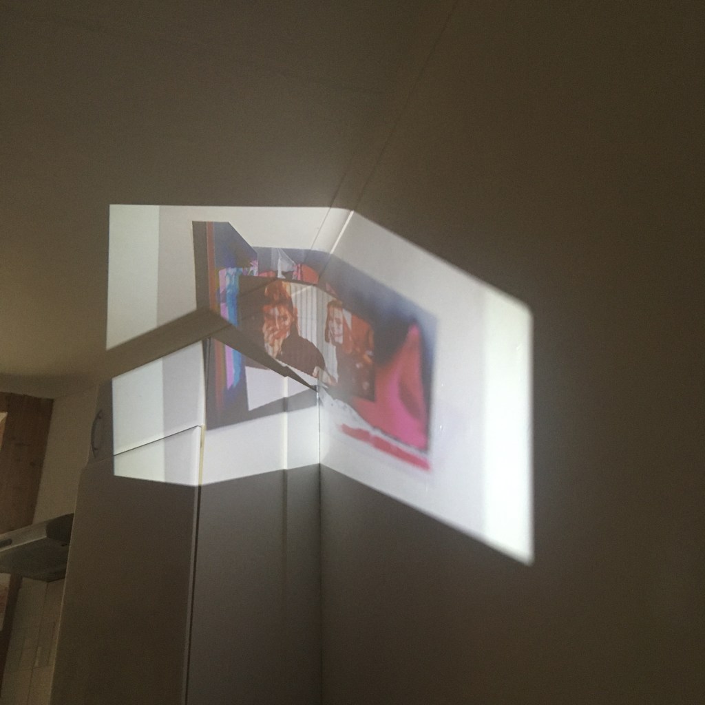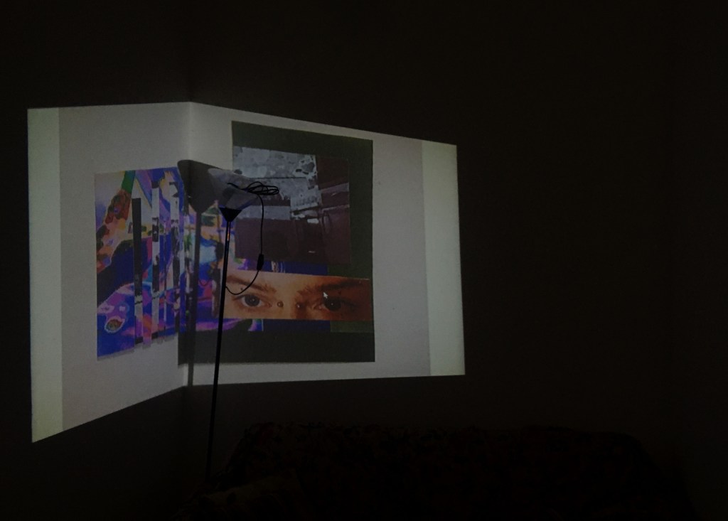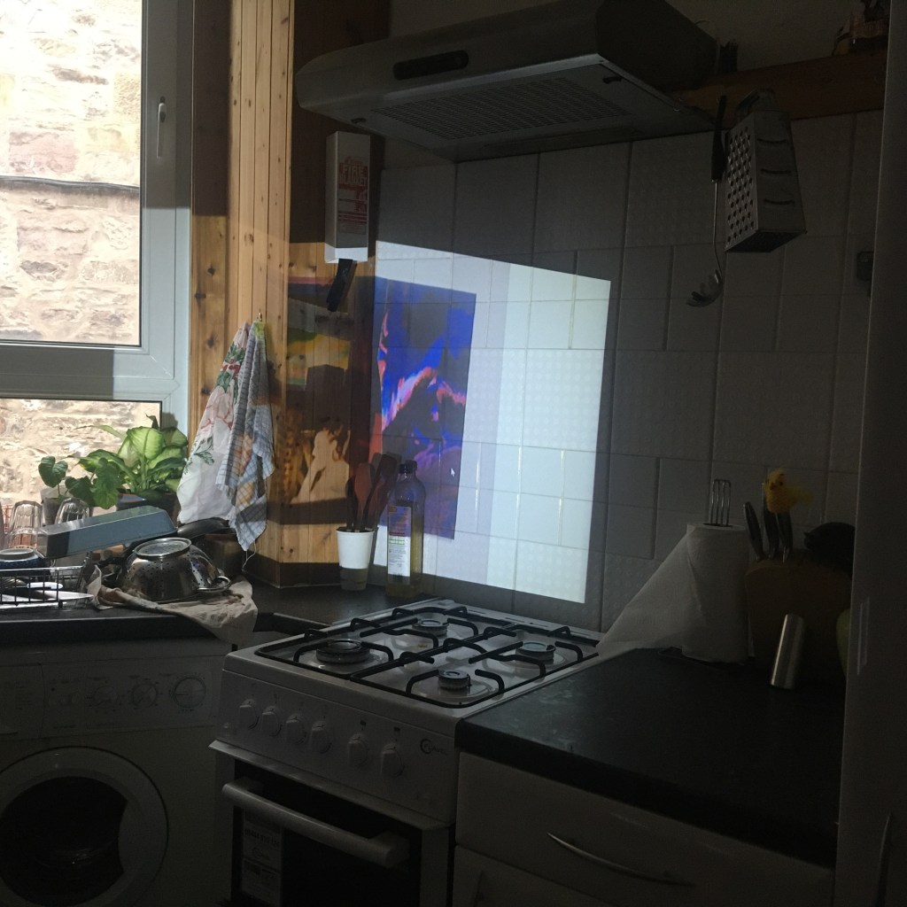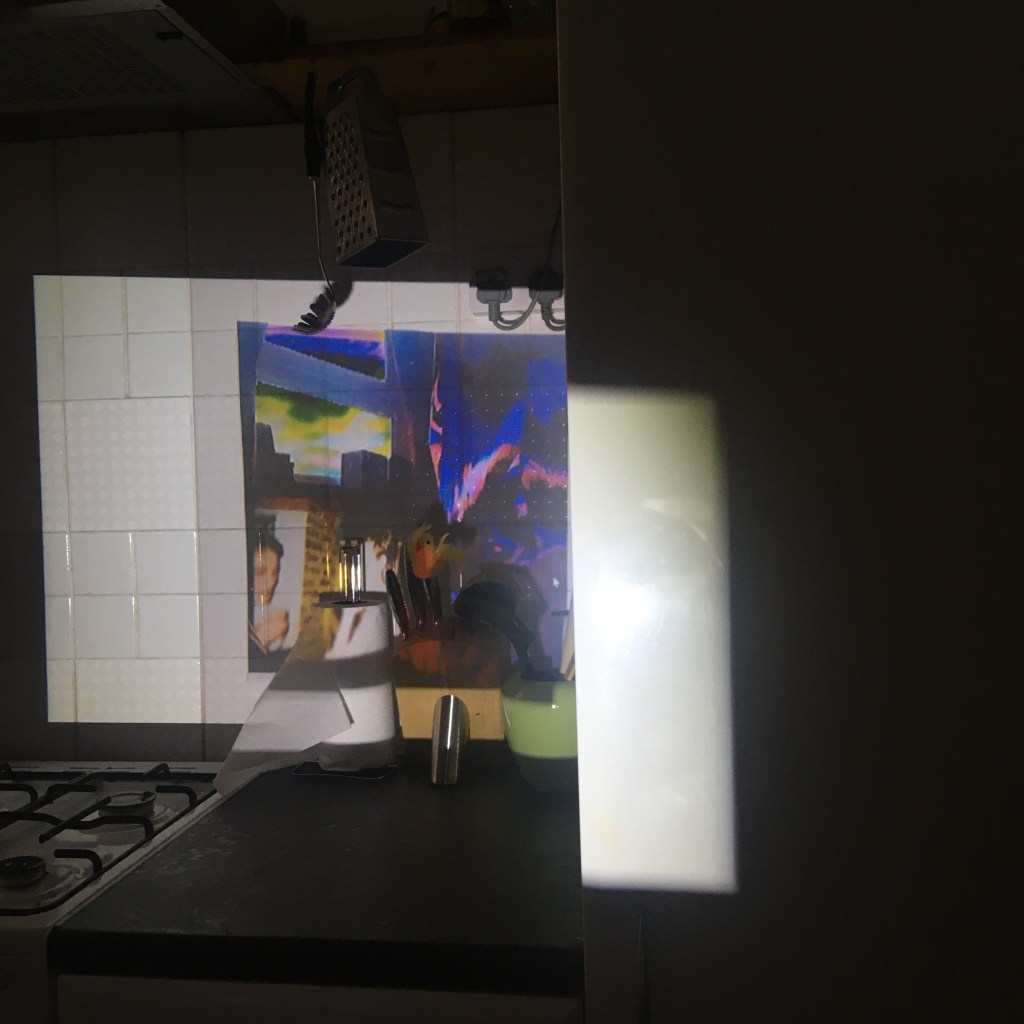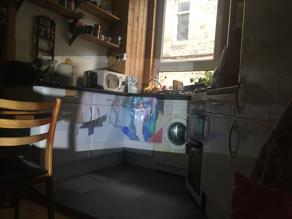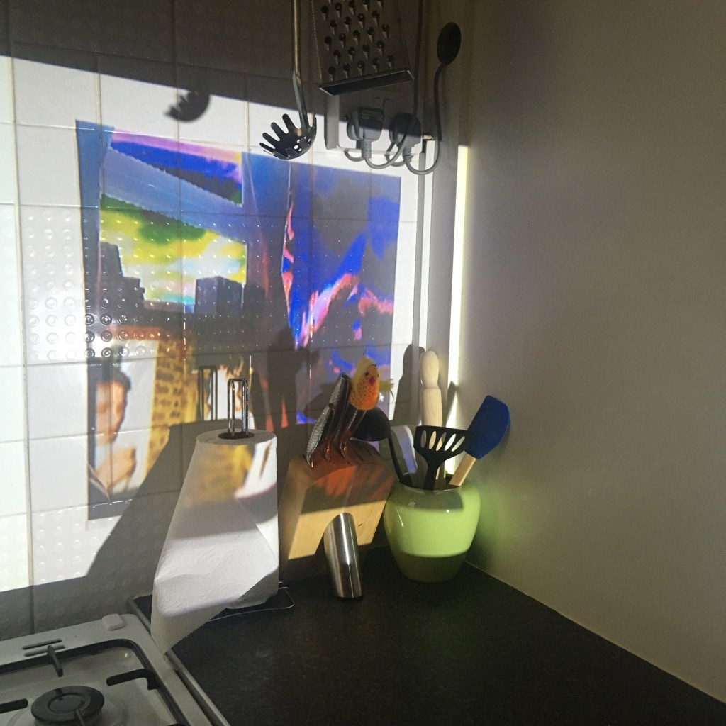 Keeping my feedback in mind, I continued with the projection and collages I made, combining them. I then edited them in Photoshop, fixing any over exposed windows, dark colours, etc. I was mindful of the shape of my projection, using furniture and walls to my advantage as it helped make the shape more interesting. I loved how the vivid colours stand out against the textures of the walls and normally average looking kitchen, and it makes me wish I could have these as permanent untraditional decoration around my home, just as some use framed pictures on the walls.