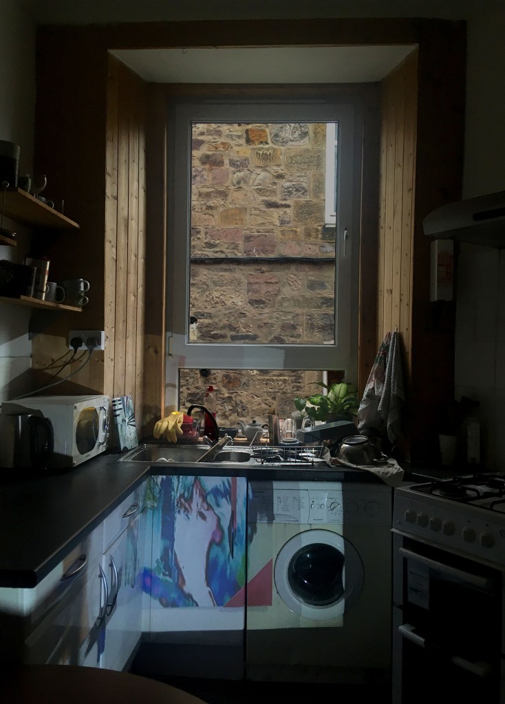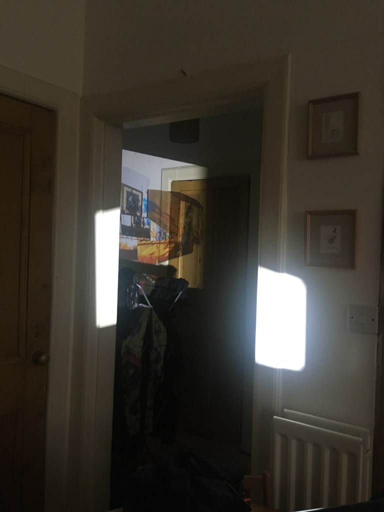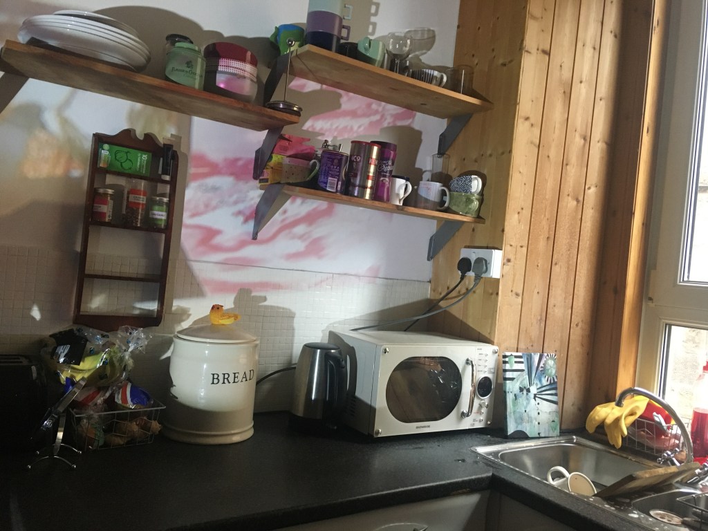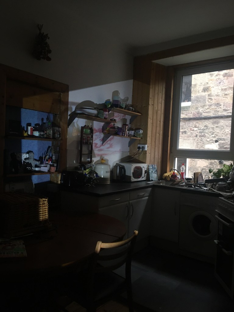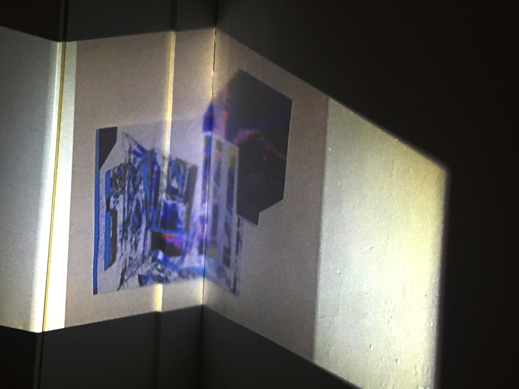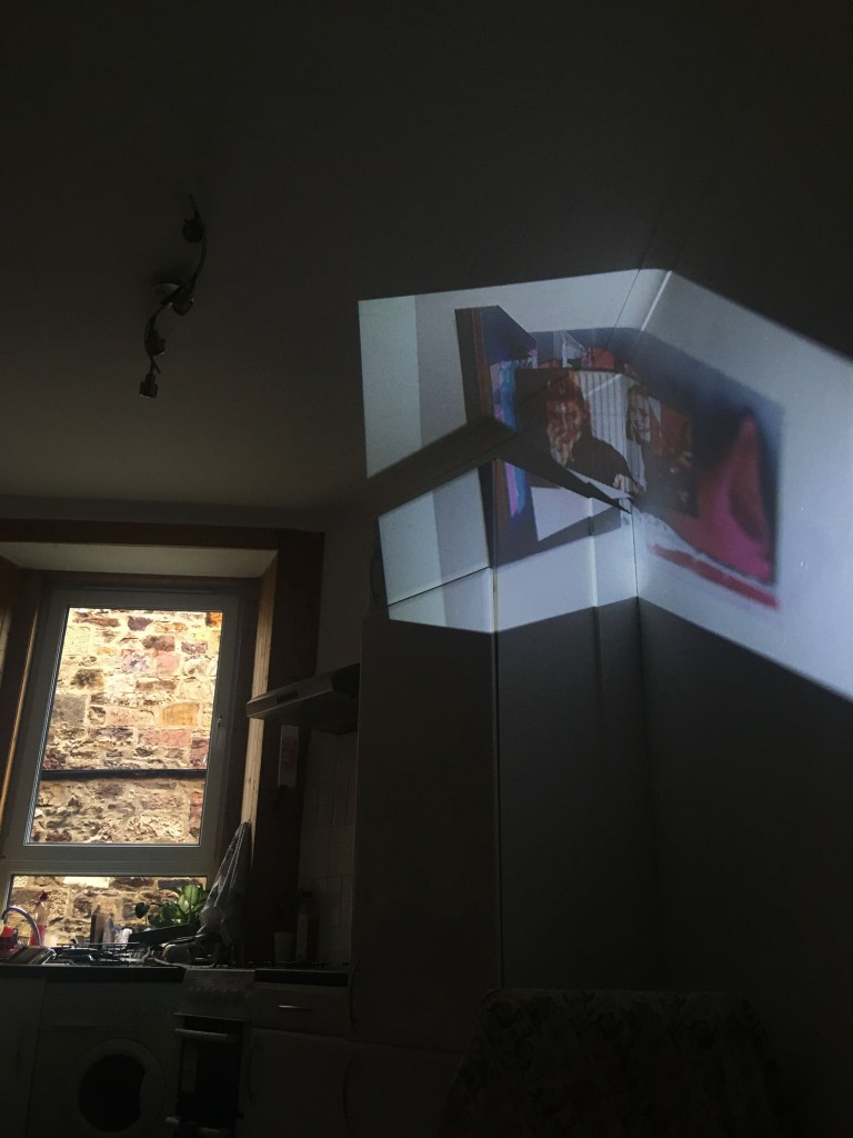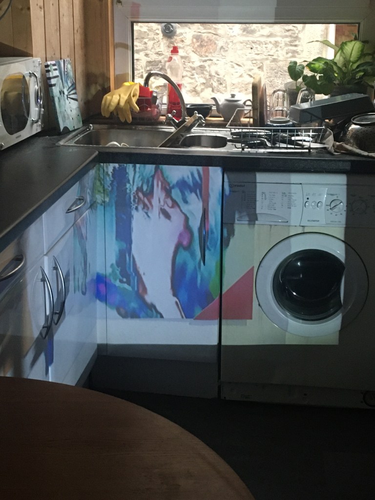 Keeping my feedback in mind, I continued with the projection and collages I made, combining them. I then edited them in Photoshop, fixing any over exposed windows, dark colours, etc. I was mindful of the shape of my projection, using furniture and walls to my advantage as it helped make the shape more interesting. I loved how the vivid colours stand out against the textures of the walls and normally average looking kitchen, and it makes me wish I could have these as permanent untraditional decoration around my home, just as some use framed pictures on the walls.