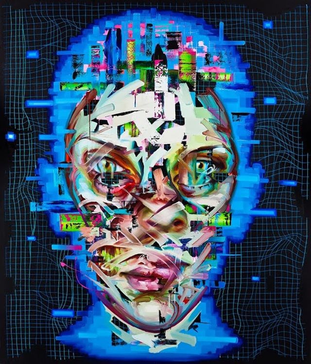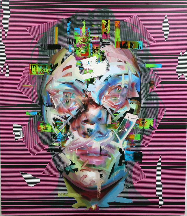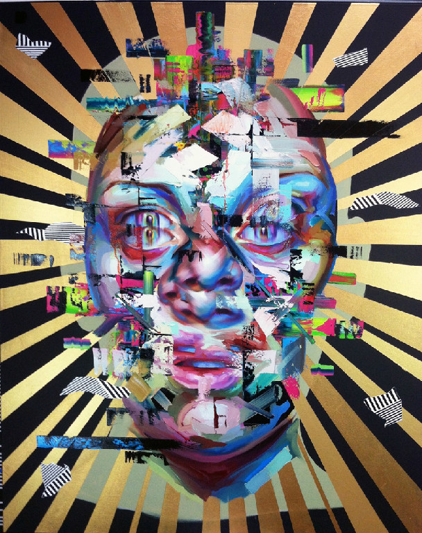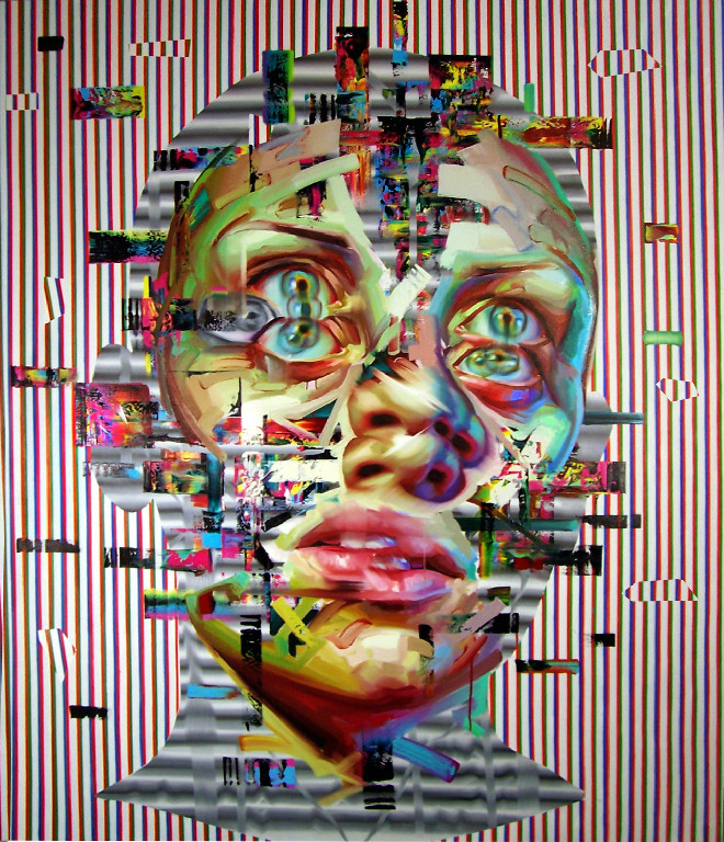 I came across Justin Bower’s work while looking for tutorials on how to draw glitches, and found that his use of short brush marks and overlapping patterns help to achieve this appearance. By multiplying the facial features, it takes away from realism and thus creates a more digital feel. I love his use of colour as his the undertones and hues used stand out from traditional portraiture, helping to add to the atmosphere of each painting.