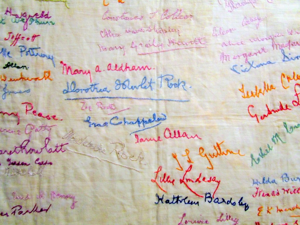 The handkerchief dated 1912 shown above displays a collection of names of women who were arrested during the suffragette movement, residing in Holloway Prison, London. Each imprisoned woman embroidered their own names as a way of documenting those who suffered.