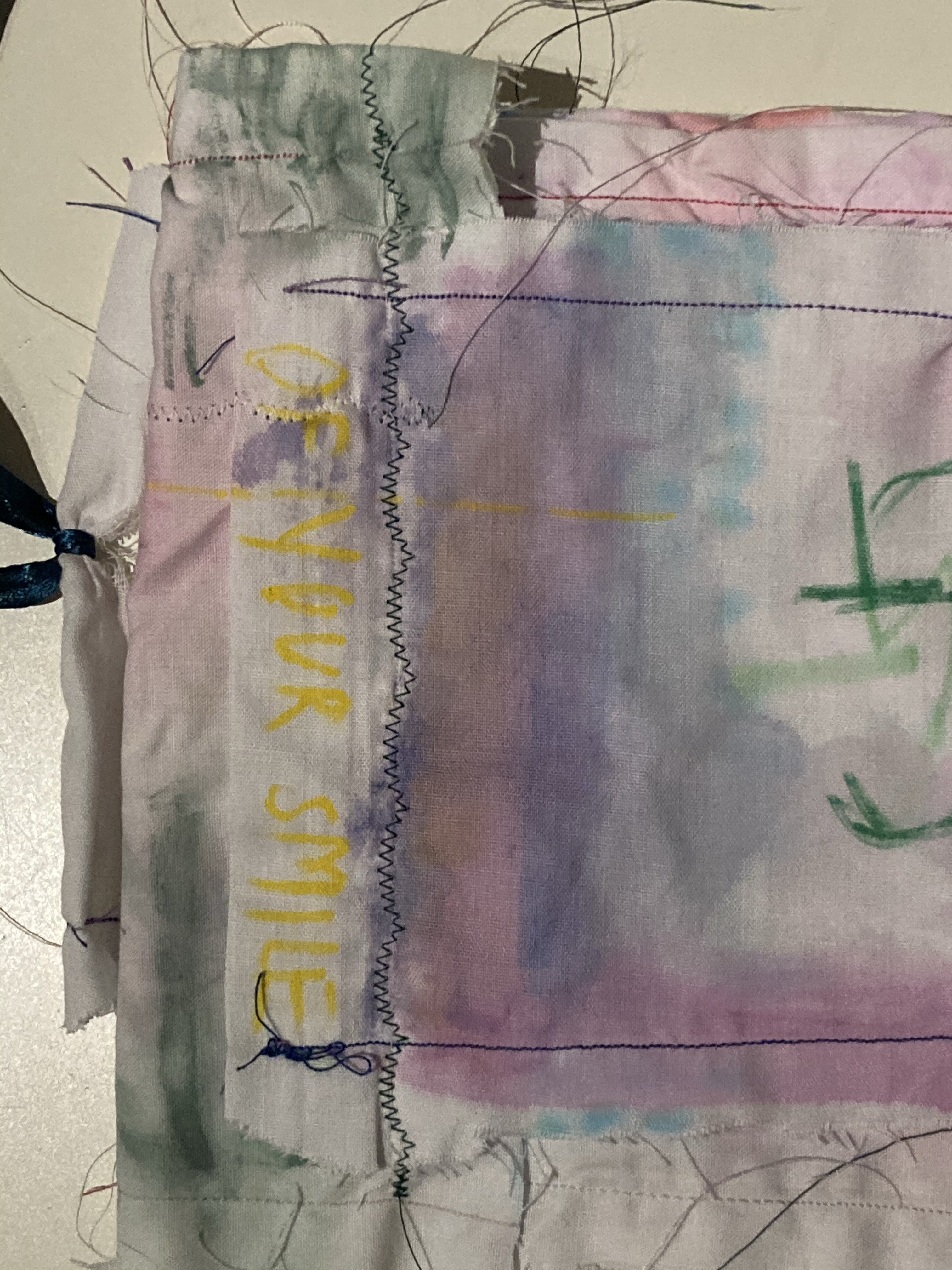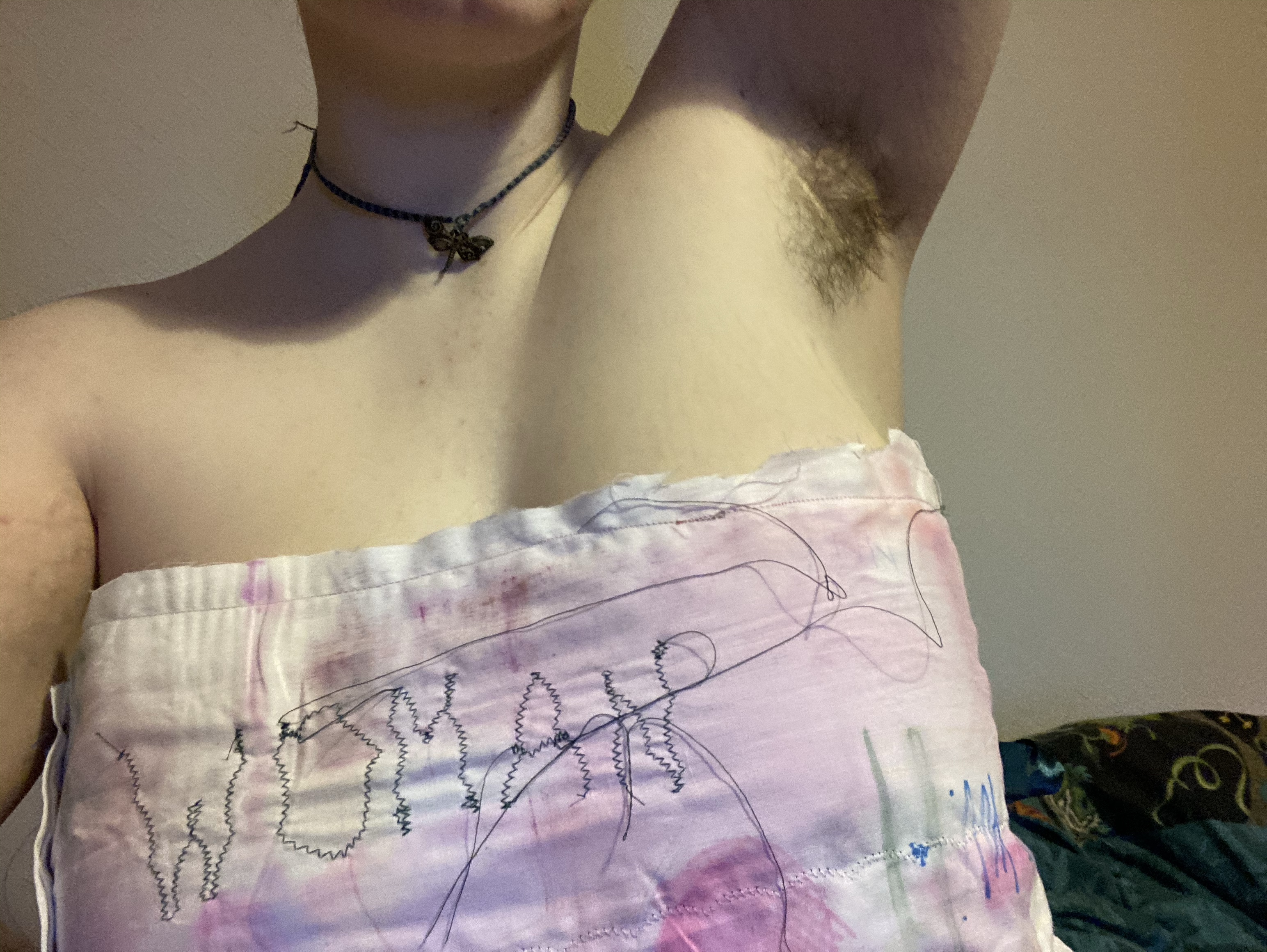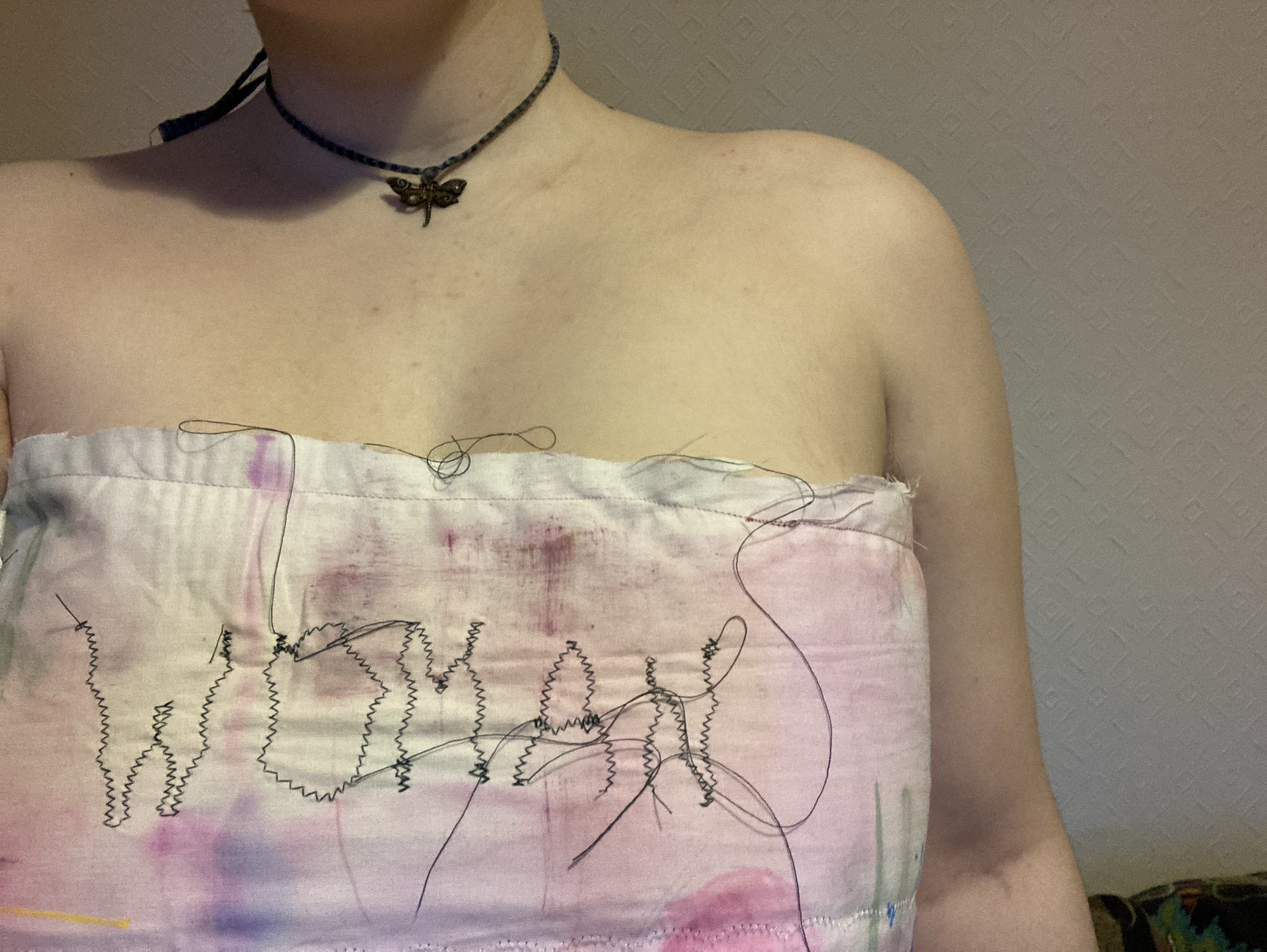 My intention was to create a bandeau top which could also be seen a binder. As I am working with strong gender related themes, I wanted to express my own experience with gender and being non-binary through text, the type of garment, and how I modelled it on my own body. Using aesthetics of my project work, I machine sewed the word ‘WOMAN’ on the front – linking to my project title and the exploration of womanhood. By showing my arm pit hair, it contradicts the gender ‘norms’ society has placed on us and the view of what a woman should be/how they should look.