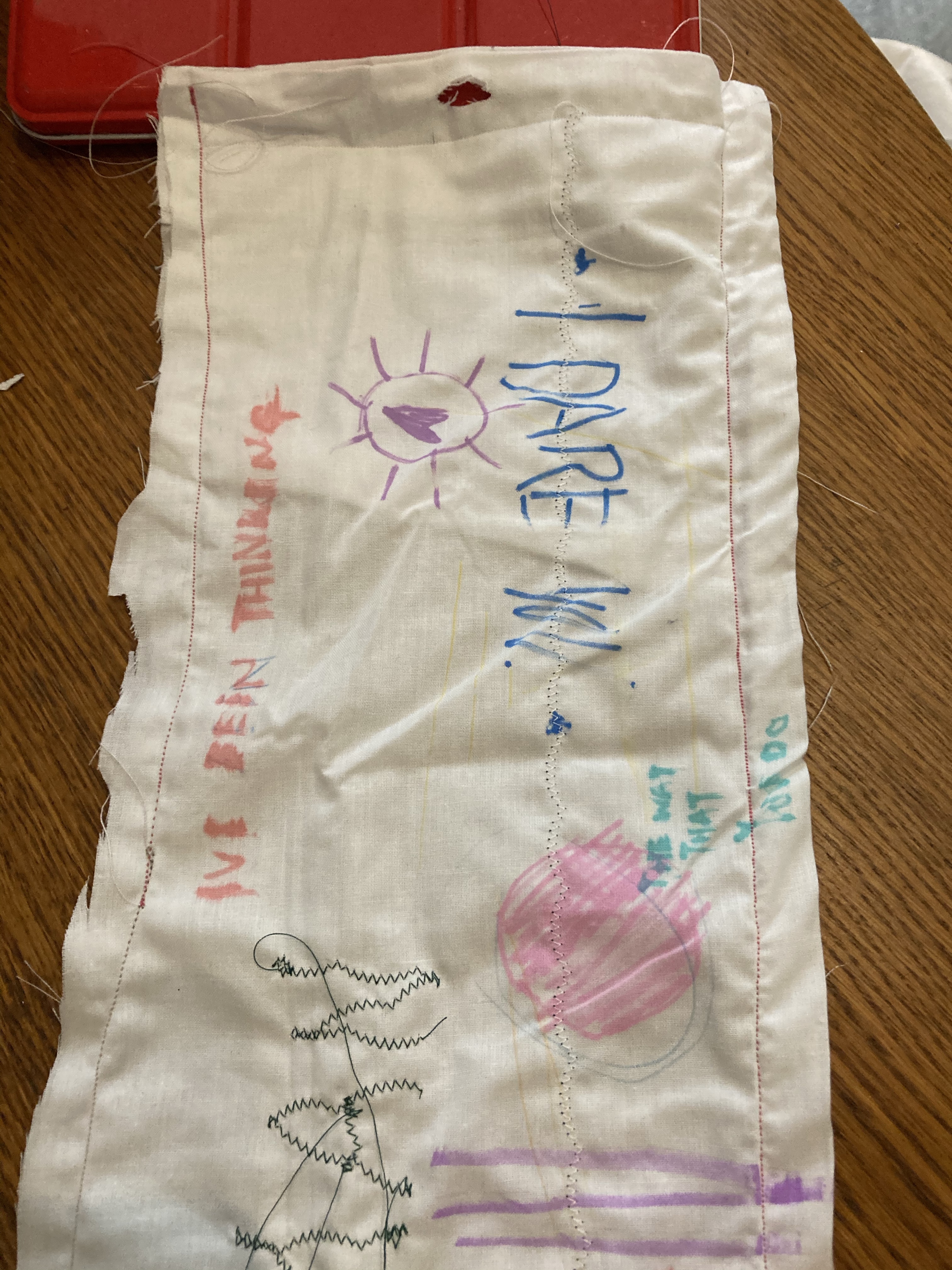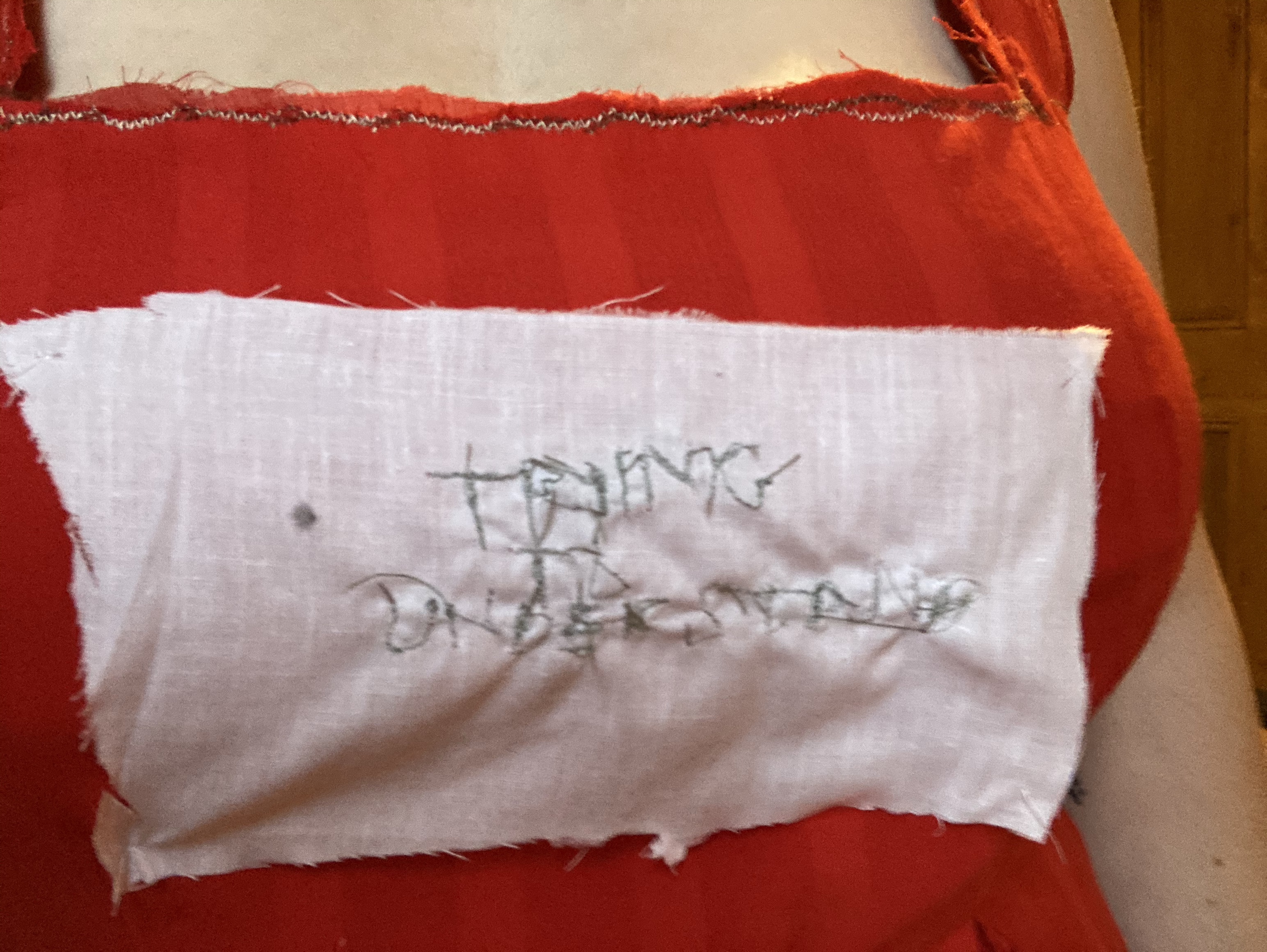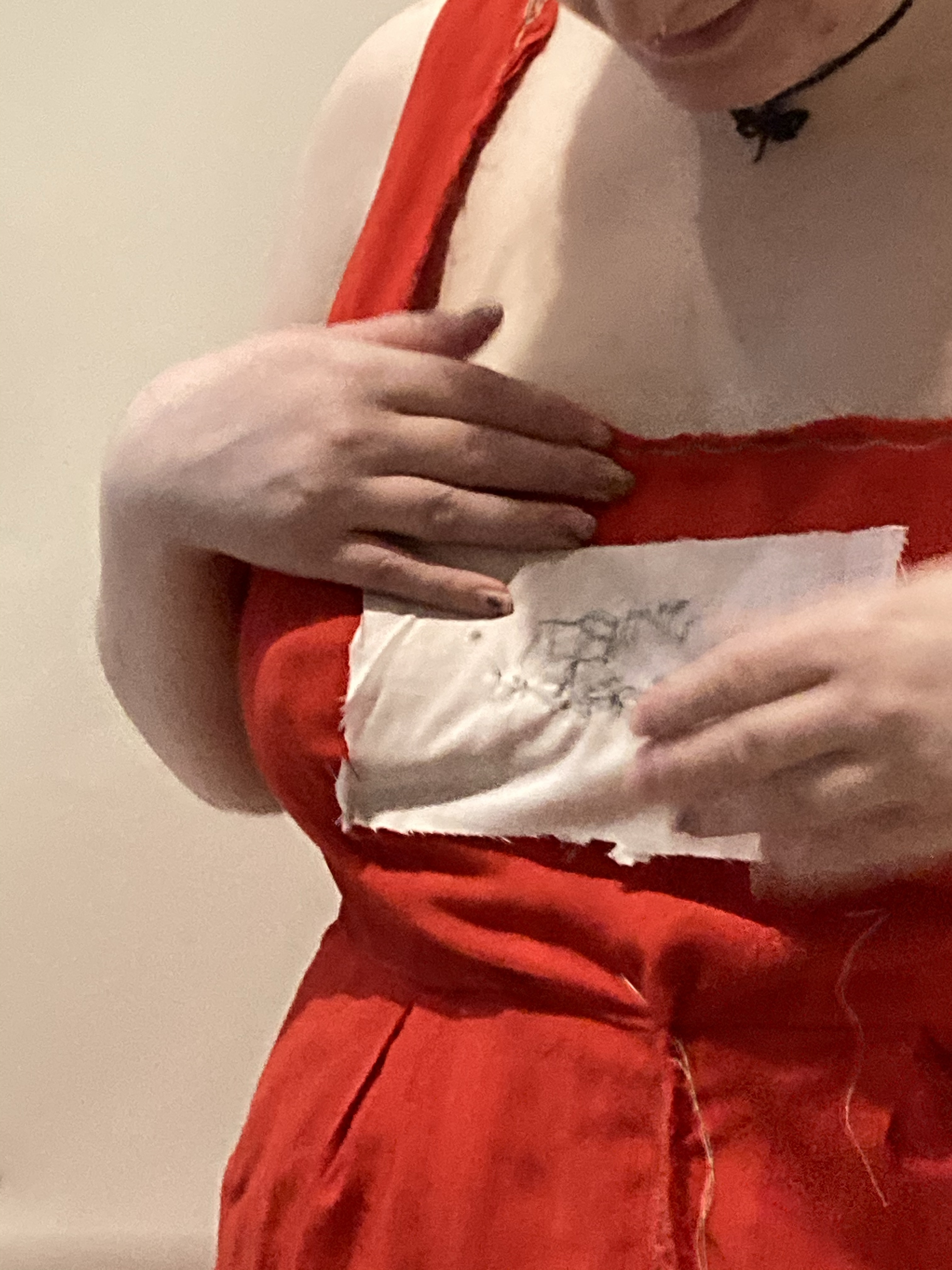 The next piece was inspired by Jennie Holzer’s note sewn onto Lorde’s dress, worn at the Grammy awards. I felt the use of a red piece of clothing worn could represent anger and frustration towards gender stereotypes, while also displaying feelings of power and strength of strong women.