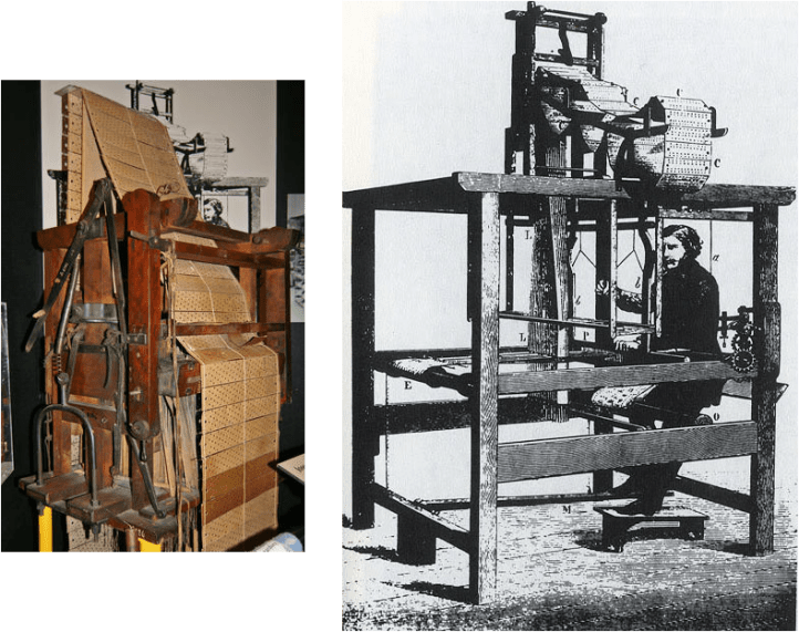 [Slideshow content: Jacquard Loom, William Morris’s ‘Acanthus and Vine’, and a weaved portrait of Joseph Marie Jacquard.]