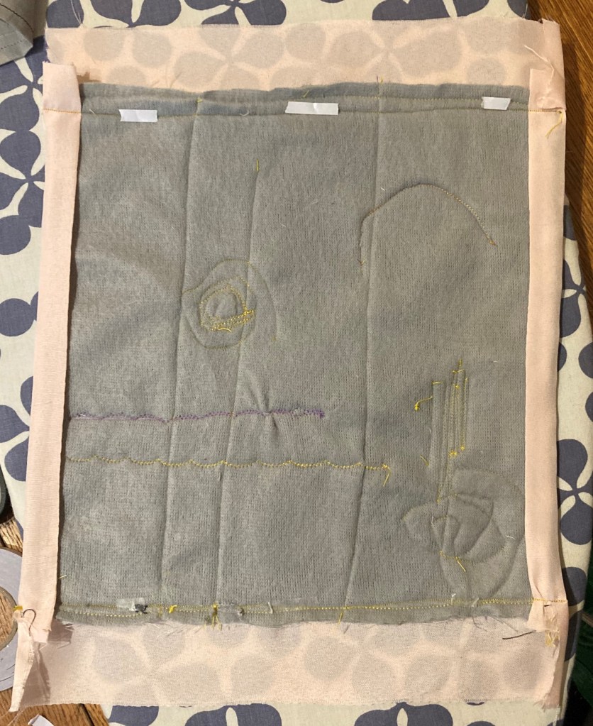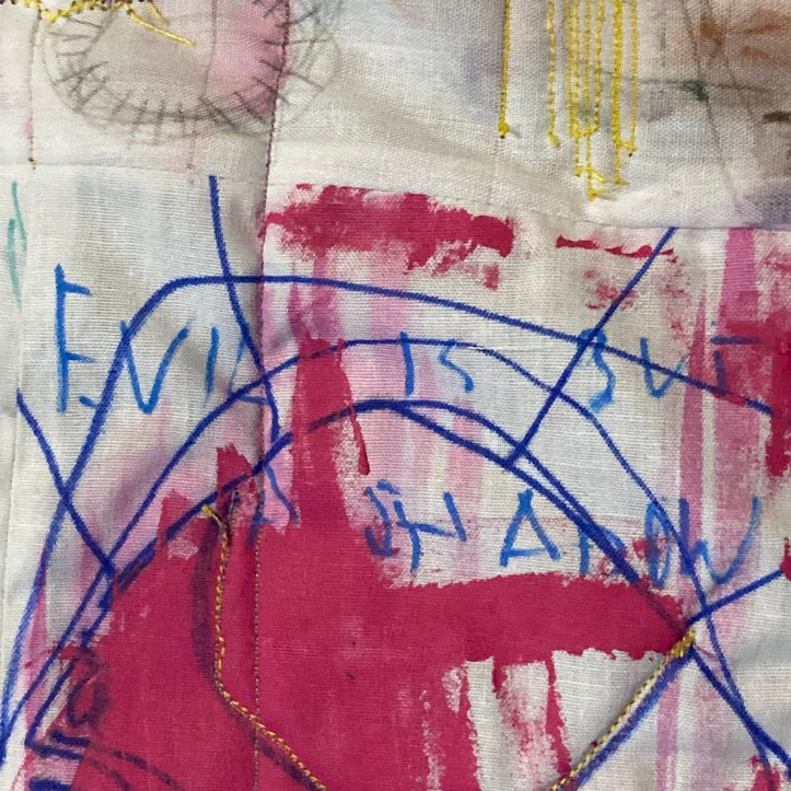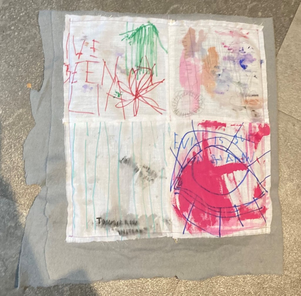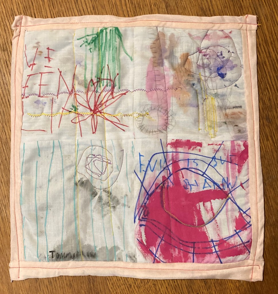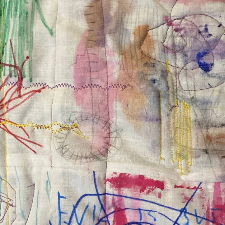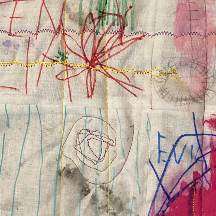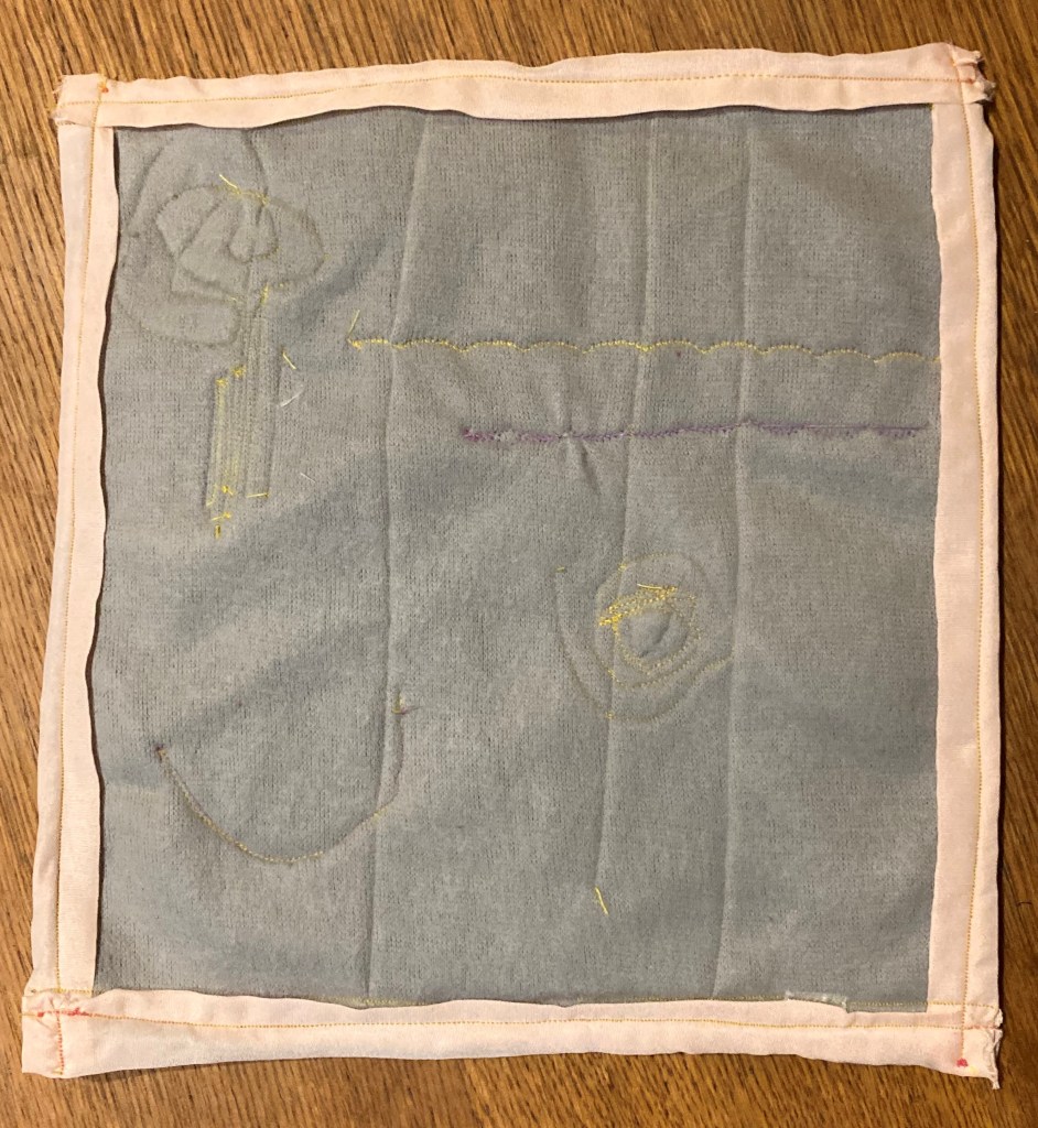 Once I had drawn onto each square, I sewed them all together to create a large square. This was then sewn onto two larger cuts of blanket to create the crucial element of the three tiers to make a quilt.