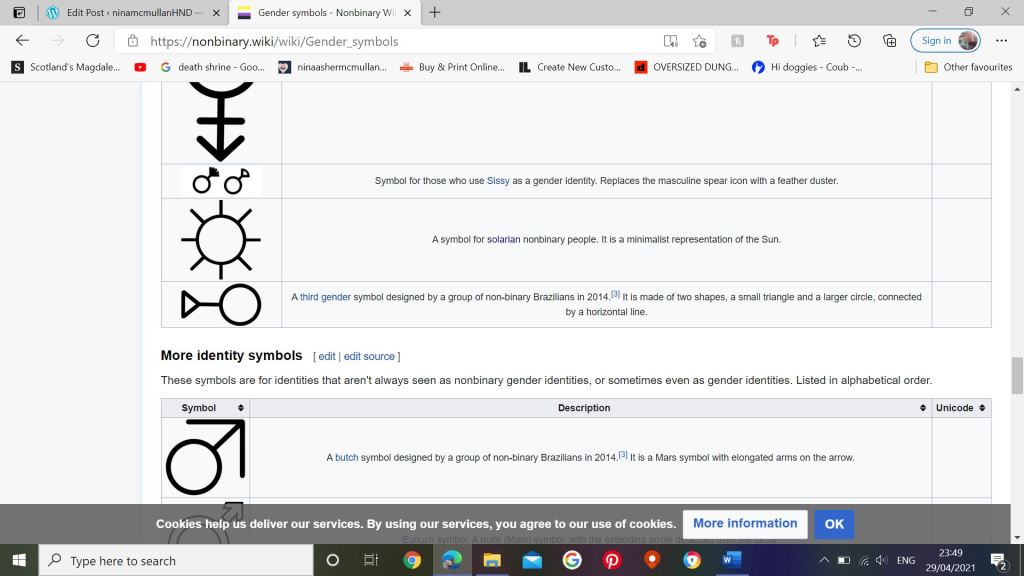 After some research and doodling, I planned to go ahead with the non-binary symbol as reference to my own gender in relation to my theme and the text used. However, with each stitch I was not happy with how it was turning out due to the size of the stitches on such a large piece. I turned this around by creating a sun shape – one I have used throughout my project. This sun shape is a symbol for solarian non-binary people, as seen below. The colour of the thread used to sew this sun is also important is it relates to the Gay Pride flag, shown in the slideshow below. Indigo/dark blue represents serenity and harmony.
