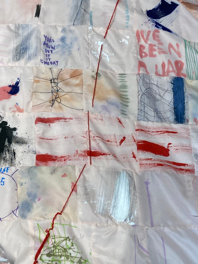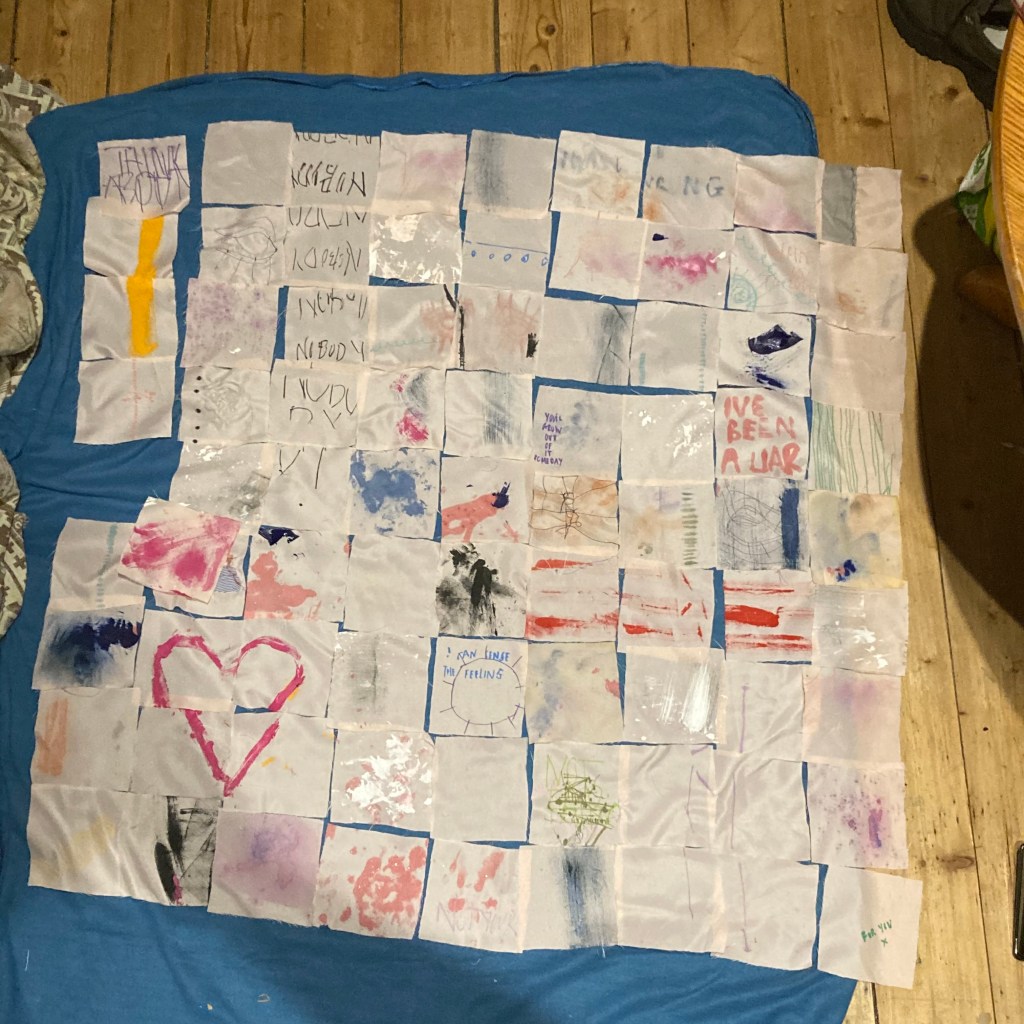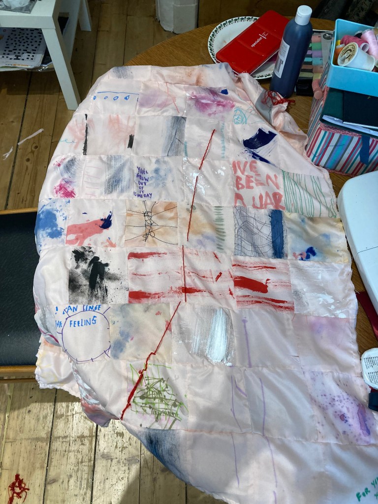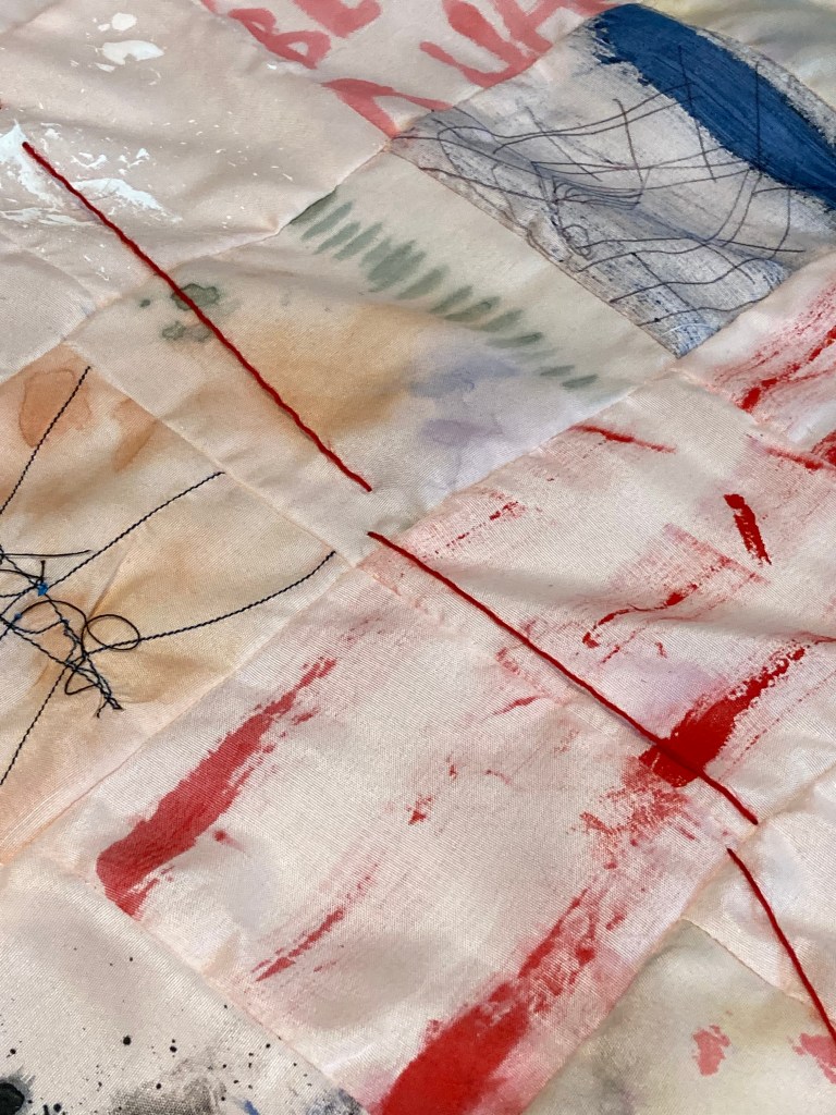 I wanted to revisit the front of the quilt to add any details before sewing it all into one piece. I was keeping in mind the importance of scaling up my marks during this, so tried out using a strong red coloured wool. I though that the red lines sewn throughout the quilt could represent blood lines – inspired by a previous collage I made in a workshop. However, I was not happy with how this was turning out as it felt too broken up, and I was worried about how the hanging untacked wool would endure someone using the quilt every day. I was also having trouble with the wool itself as it was too thick to pass through my needle, so I had to unwind it into smaller pieces. In the end, I did not carry on with this method.