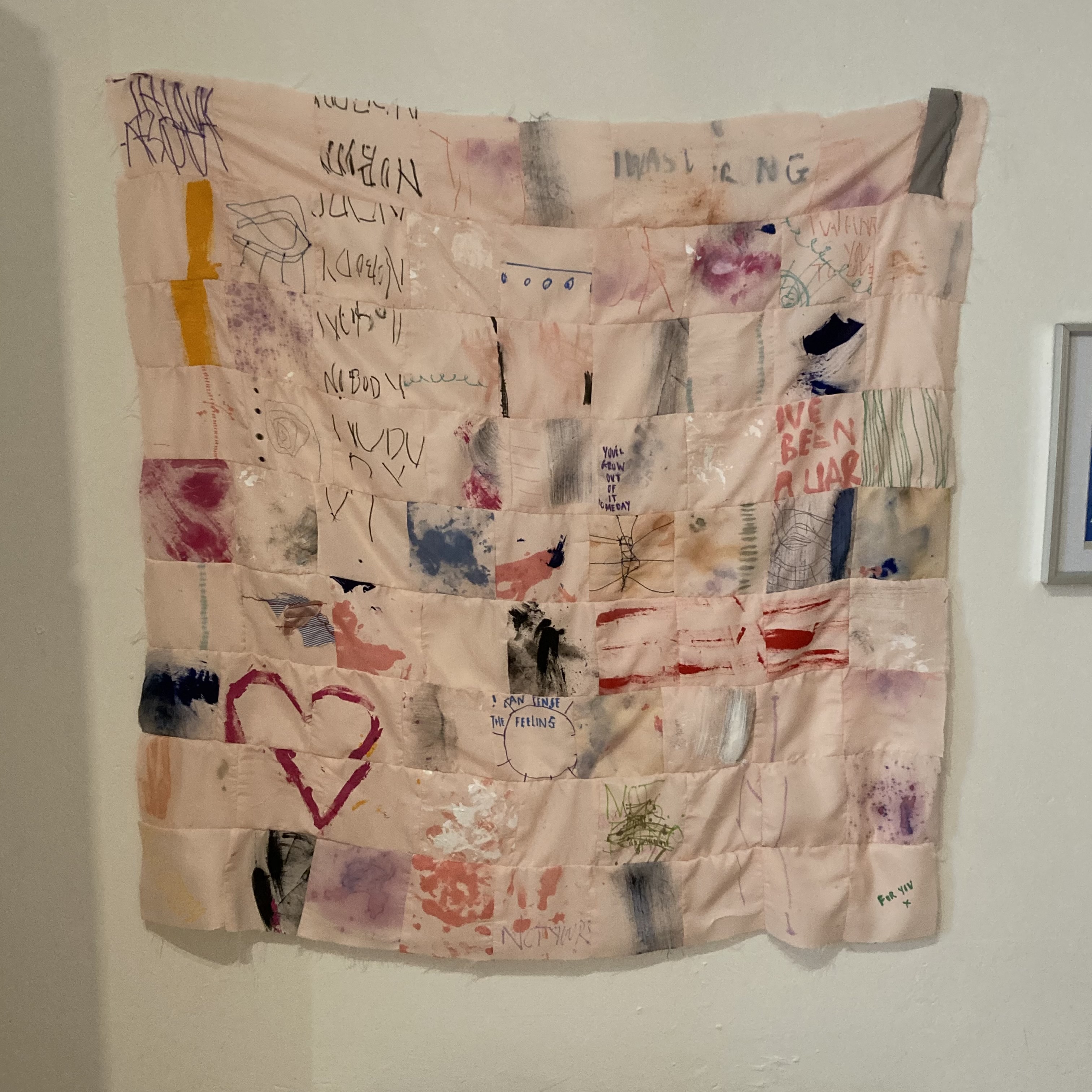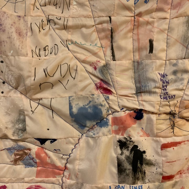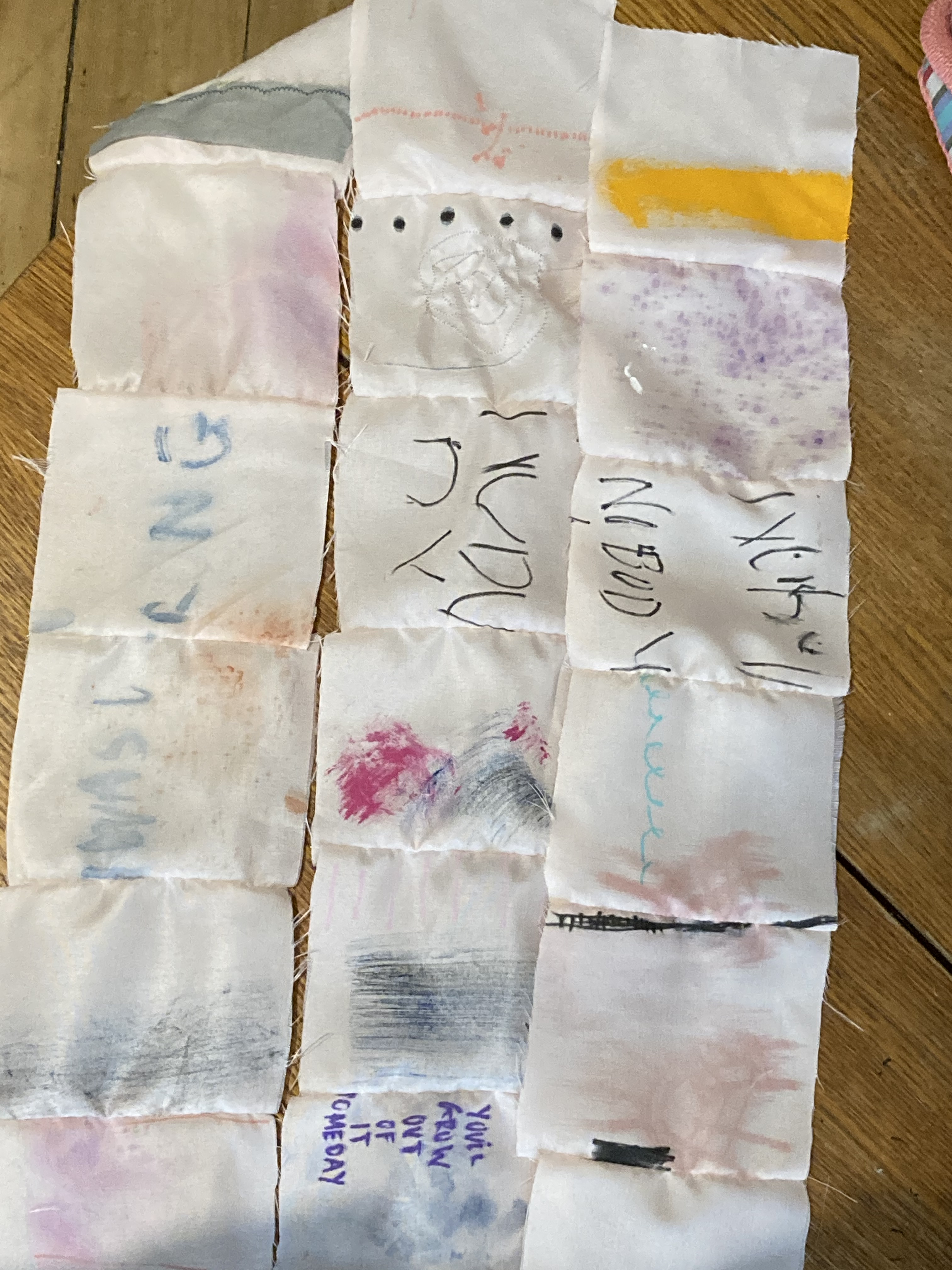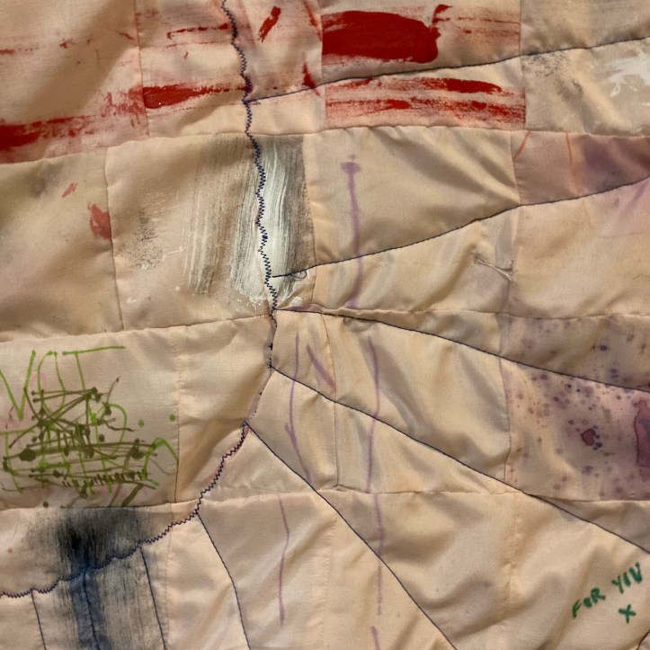 I wanted to revisit the front of the quilt to add any details before sewing it all into one piece. I was keeping in mind the importance of scaling up my marks during this, so tried out using a strong red coloured wool. I though that the red lines sewn throughout the quilt could represent blood lines – inspired by a previous collage I made in a workshop. However, I was not happy with how this was turning out as it felt too broken up, and I was worried about how the hanging untacked wool would endure someone using the quilt every day. I was also having trouble with the wool itself as it was too thick to pass through my needle, so I had to unwind it into smaller pieces. In the end, I did not carry on with this method.