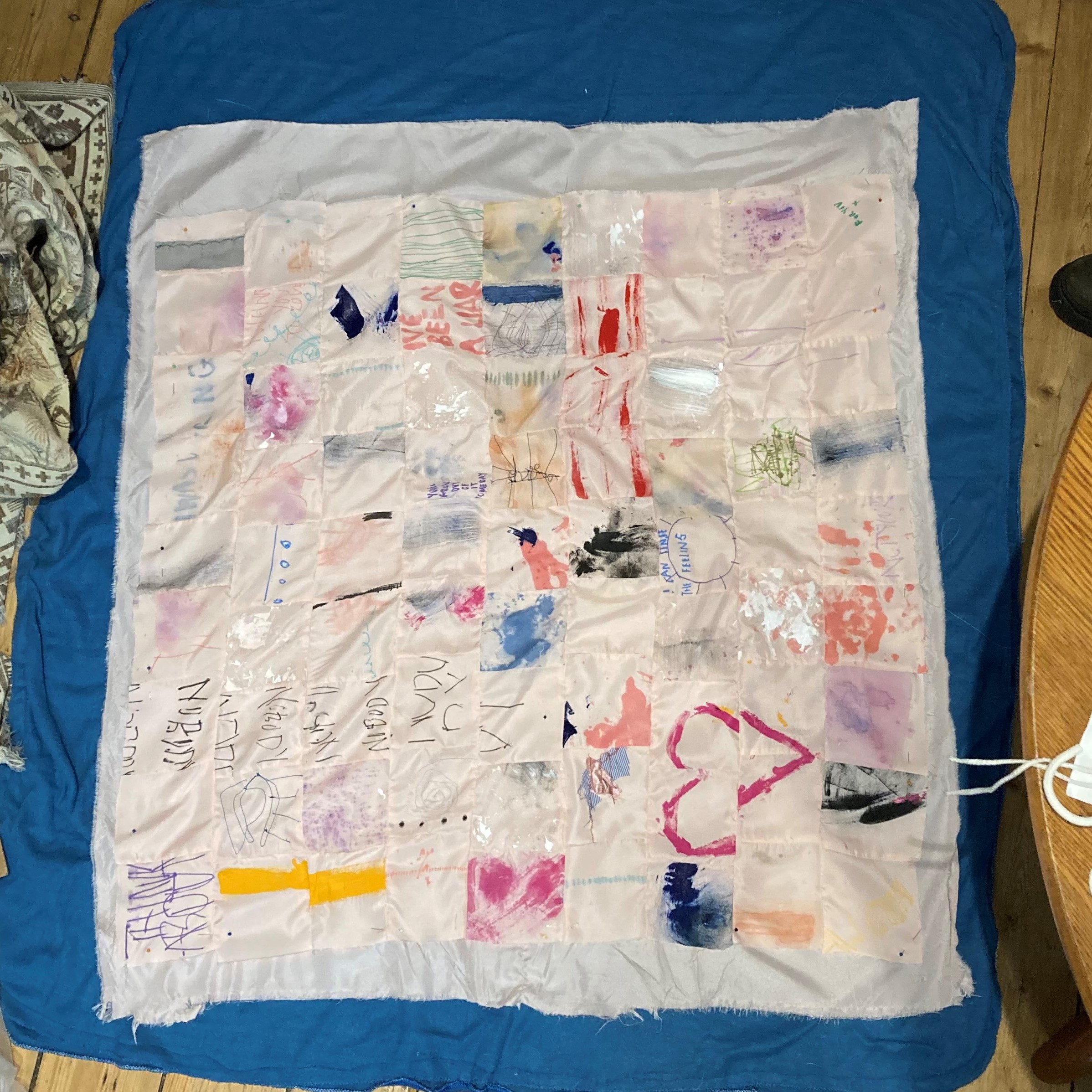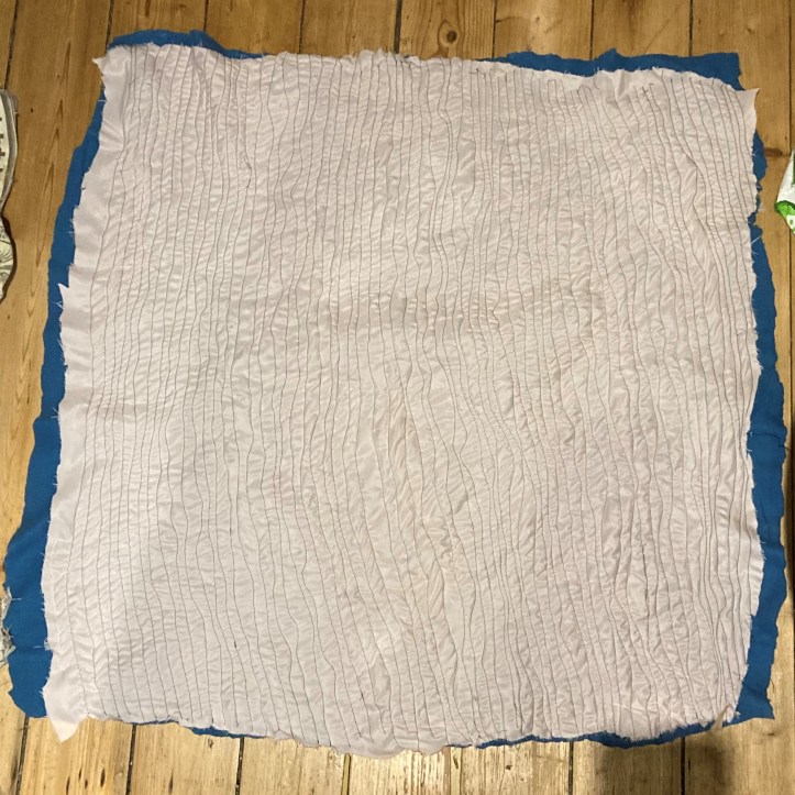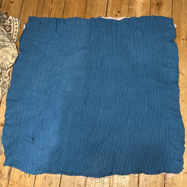 I then sewed each square together in rows of 9, then all together to make one large square. As well as time consuming, this was a difficult process due to the shape of the squares as they were not all perfectly even. After all sewn together, I then had to add a second whole layer behind the squares due to the transparency of the material and the strong blue of the inner material.