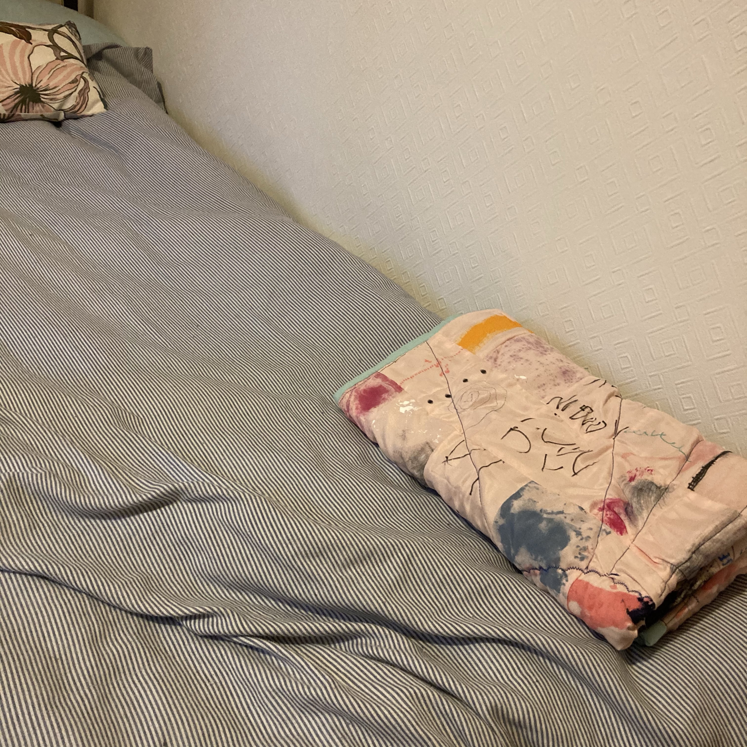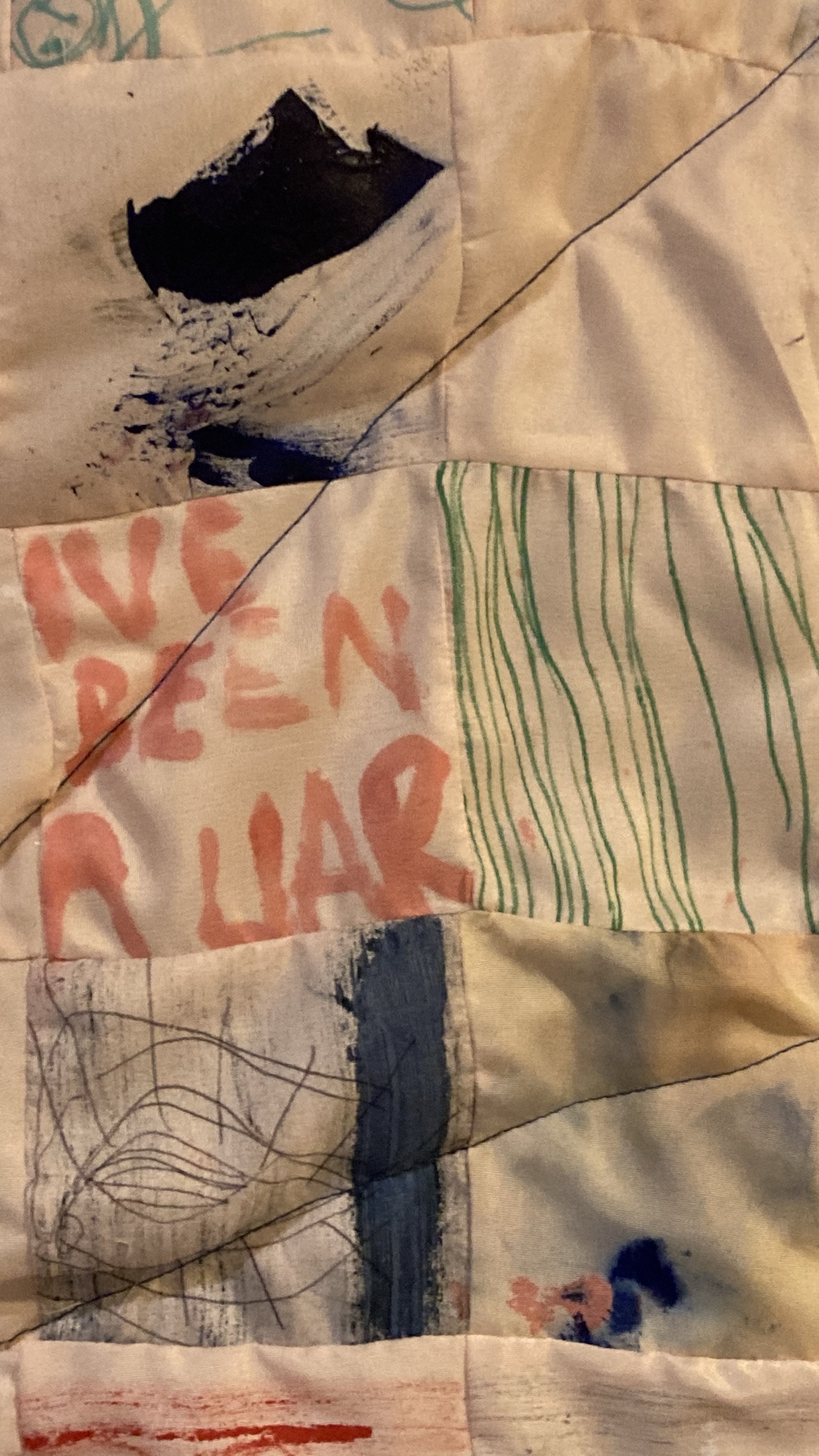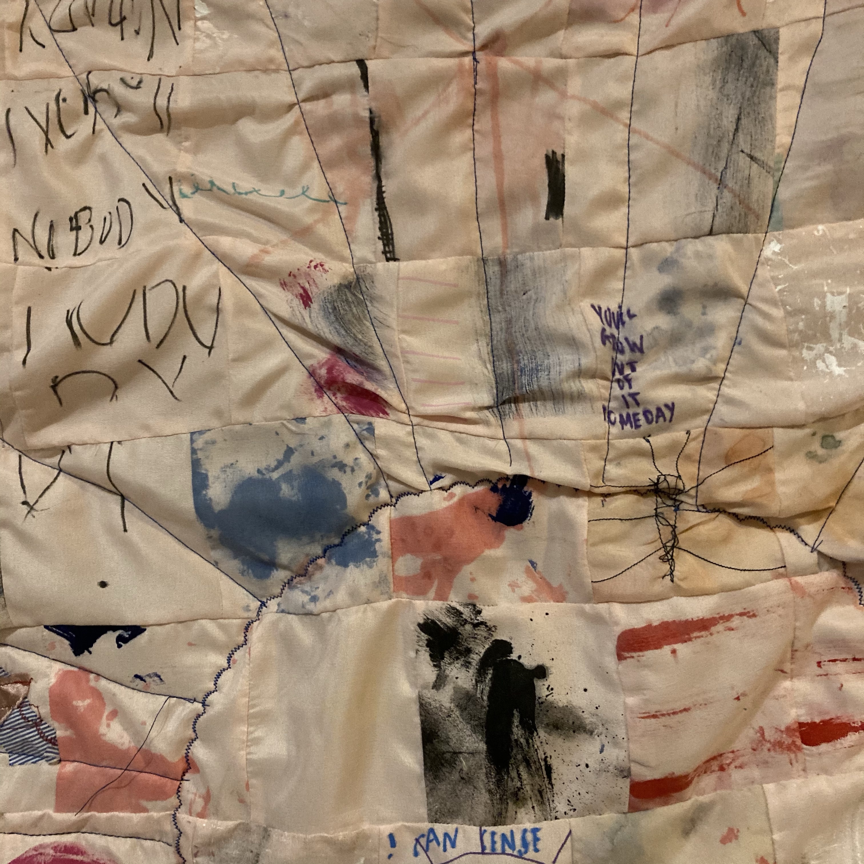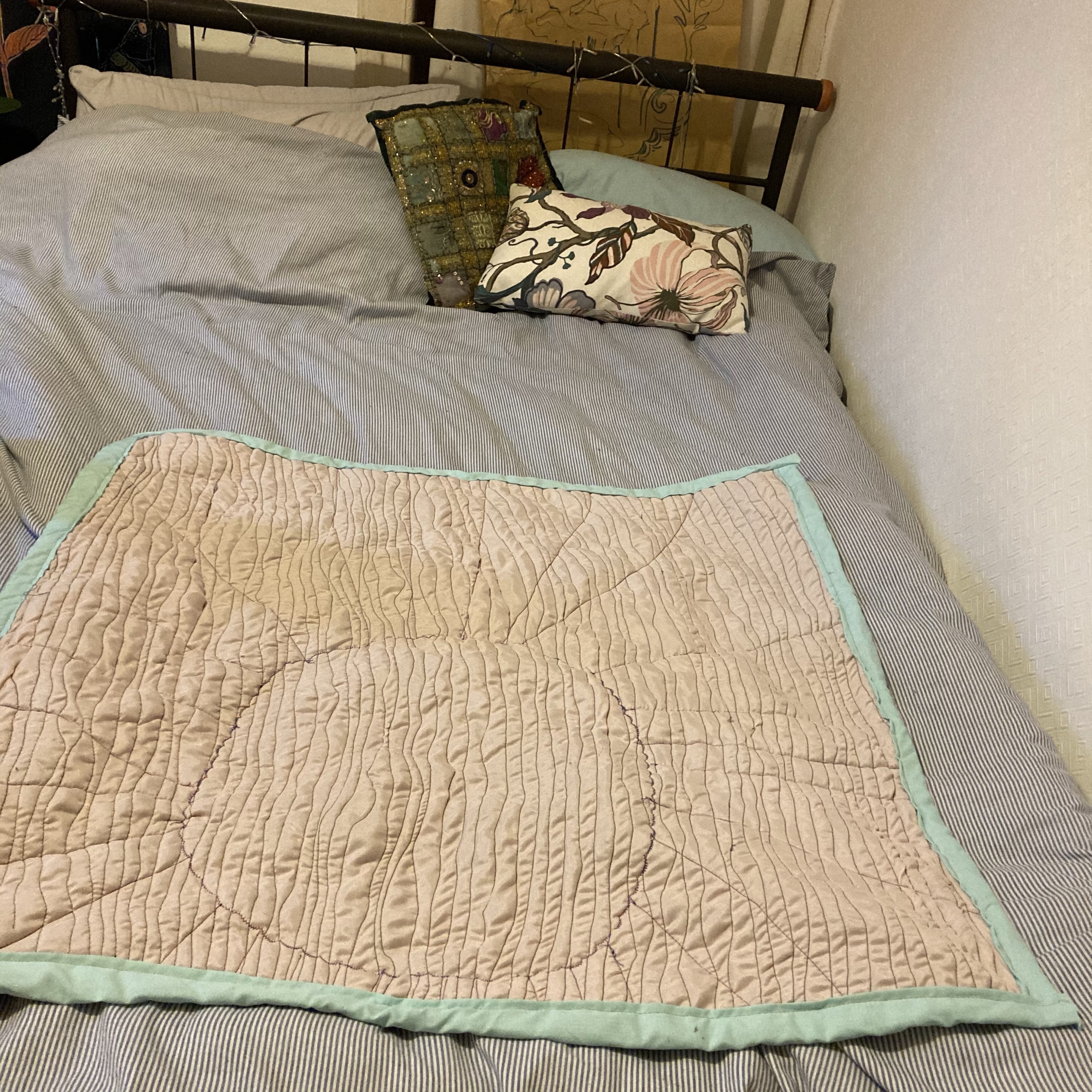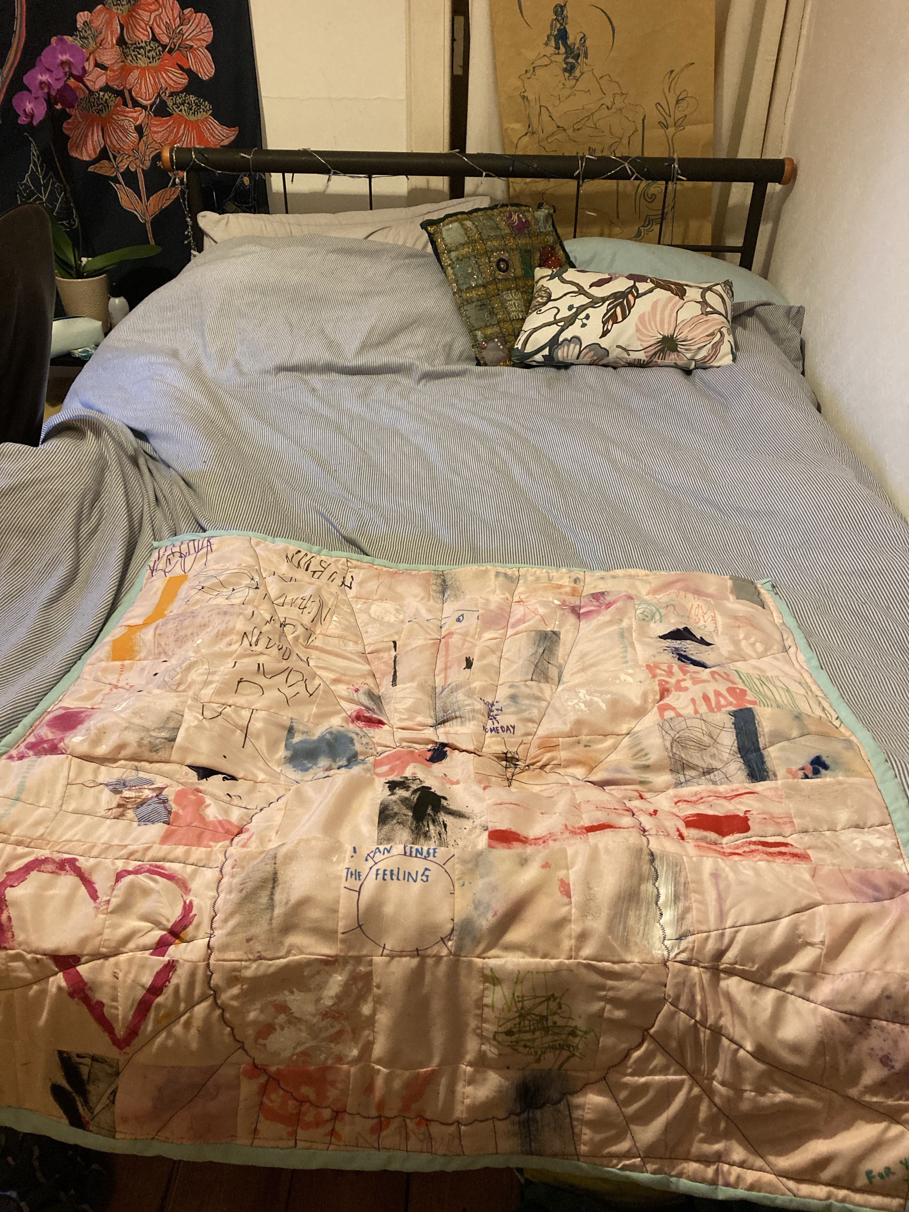 I’m proud of what I have made and feel it is a huge improvement from my first experiment. I have never worked with sewing in that scale before, but definitely enjoyed it and would do it again. It’s so rewarding to see something you have made and be able to use it/hang it in your own home. Each individual square has its own meaning and emotion, all combined into one comfy square. The border was a little bit difficult in some parts due to the squares being different sizes, but I’m surprised to say you can’t really tell in the end. Especially if this is used as a quilt, it will not sit perfectly anyway so minor mistakes won’t be noticeable.